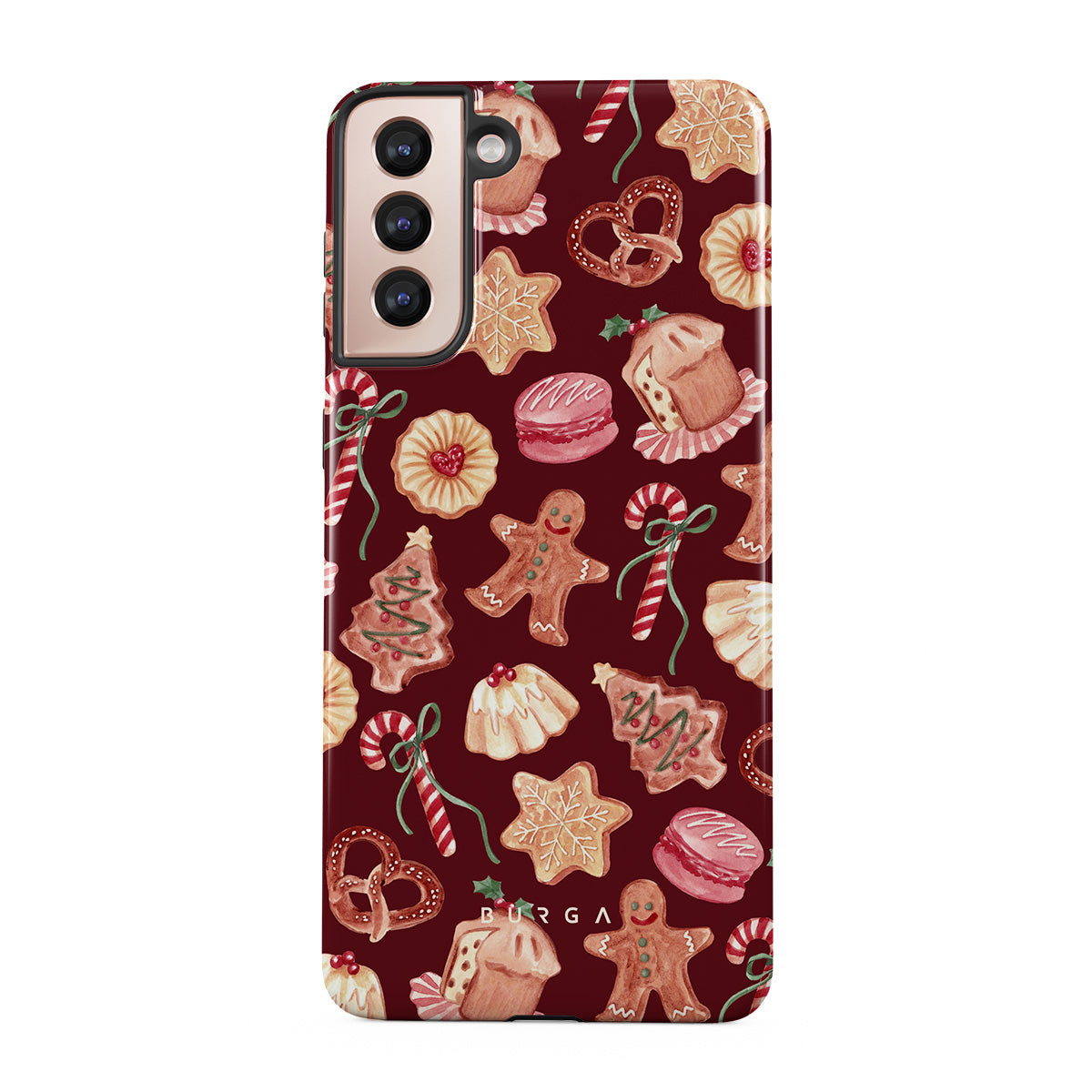 En este diseño: galletas de Navidad, hombres de jengibre, bastones de caramelo, caramelos de menta, dulces festivos, fondo rojo burdeos