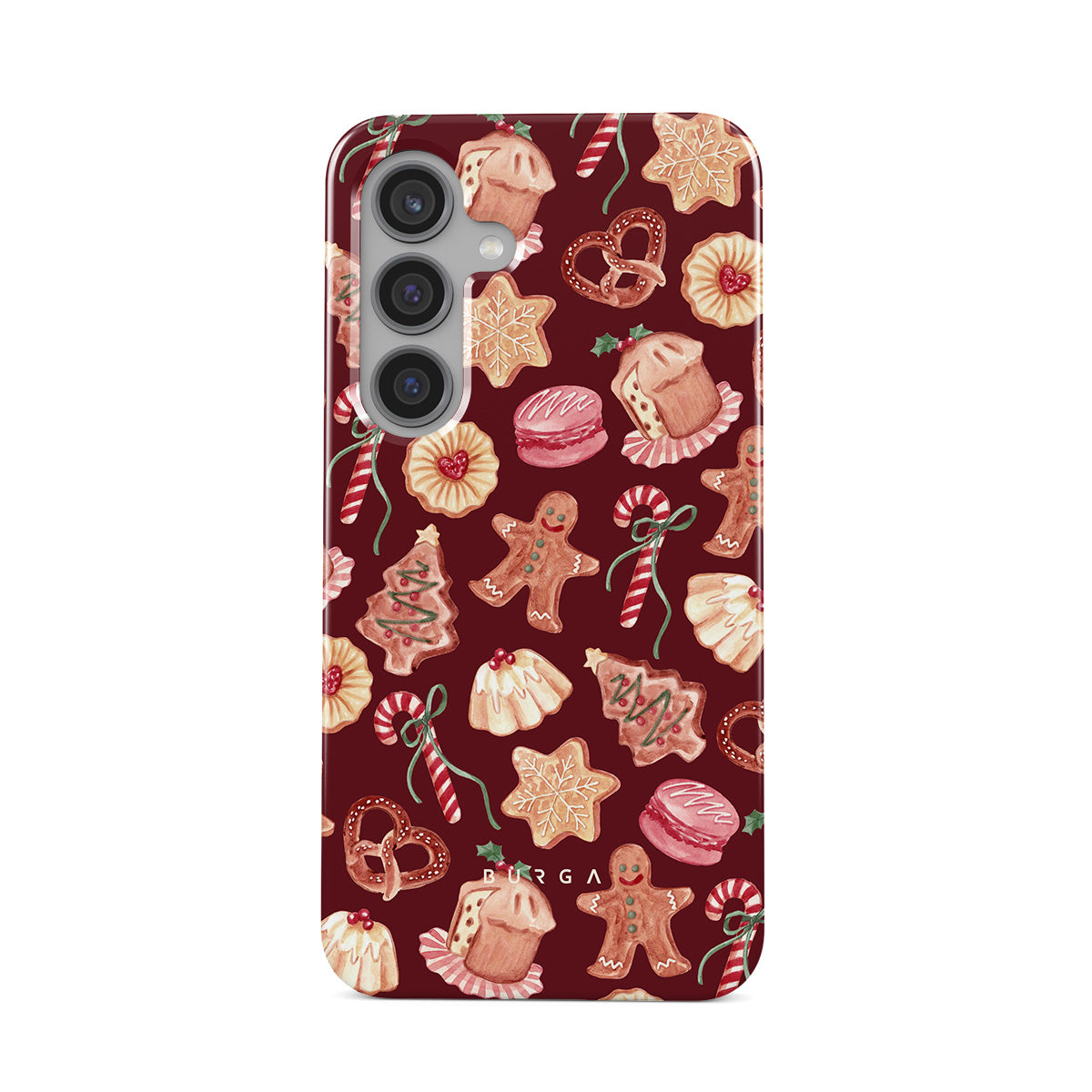 En este diseño: galletas de Navidad, hombres de jengibre, bastones de caramelo, caramelos de menta, dulces festivos, fondo rojo burdeos