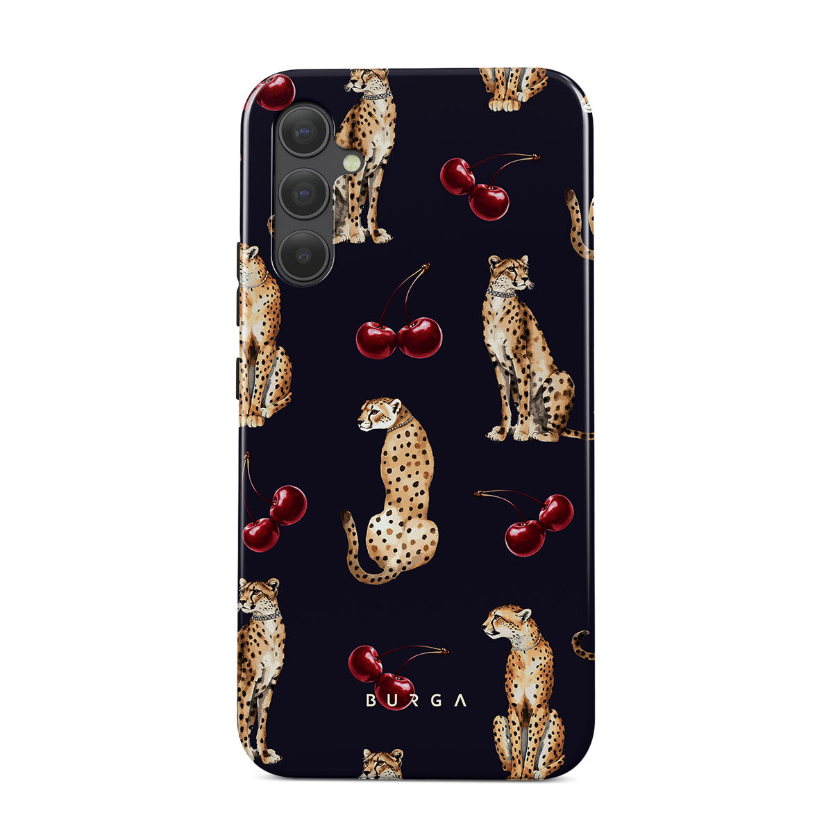 Este diseño presenta: estampado de leopardo, leopardos, cerezas.