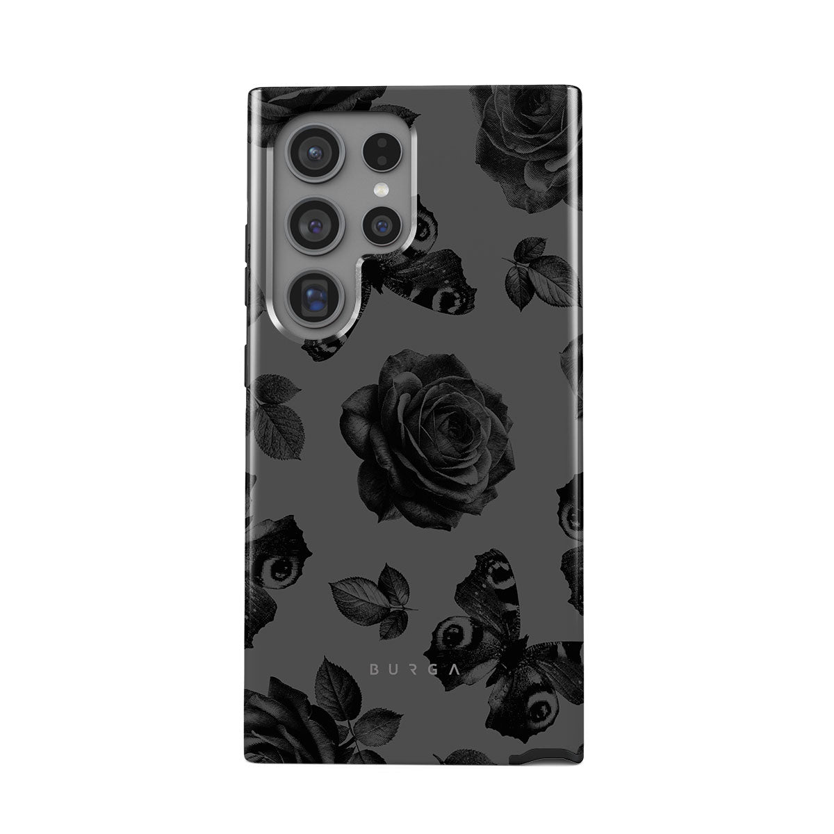 En este diseño: rosas negras, flores góticas, sombras tenebrosas.