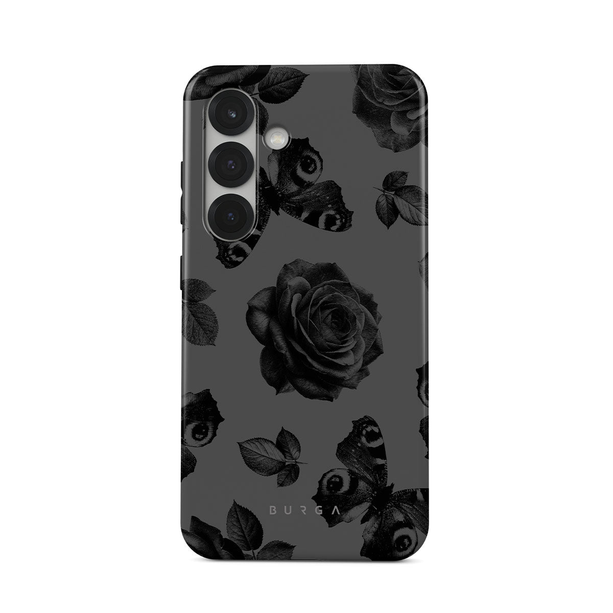 En este diseño: rosas negras, flores góticas, sombras tenebrosas.