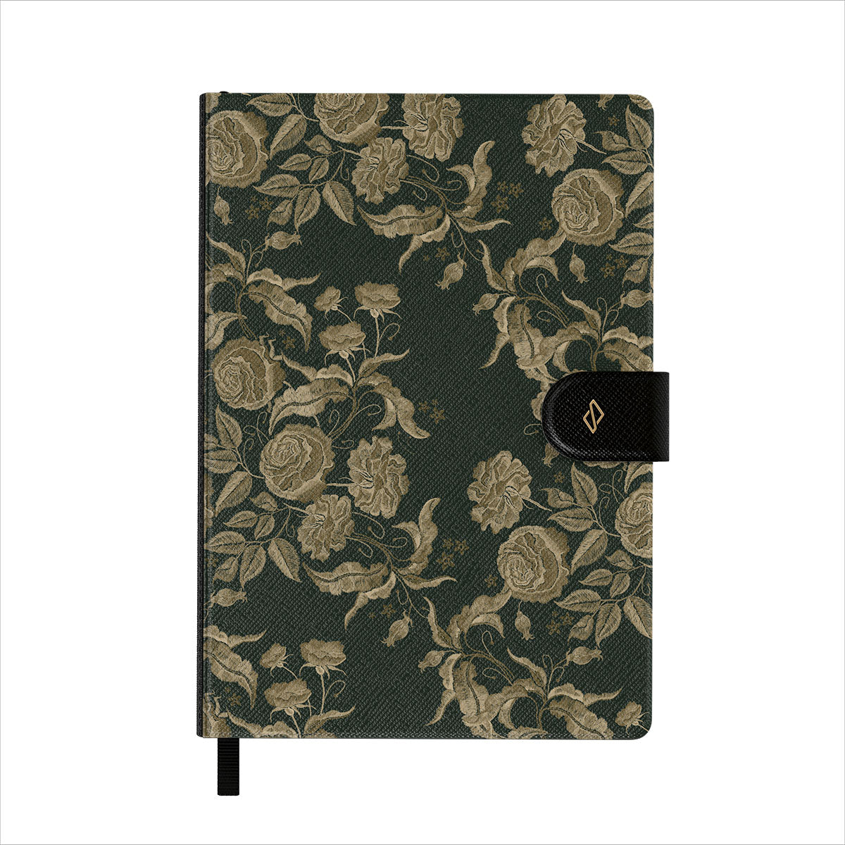 En este diseño: rosas vintage, hojas doradas, tonos verde intenso.
