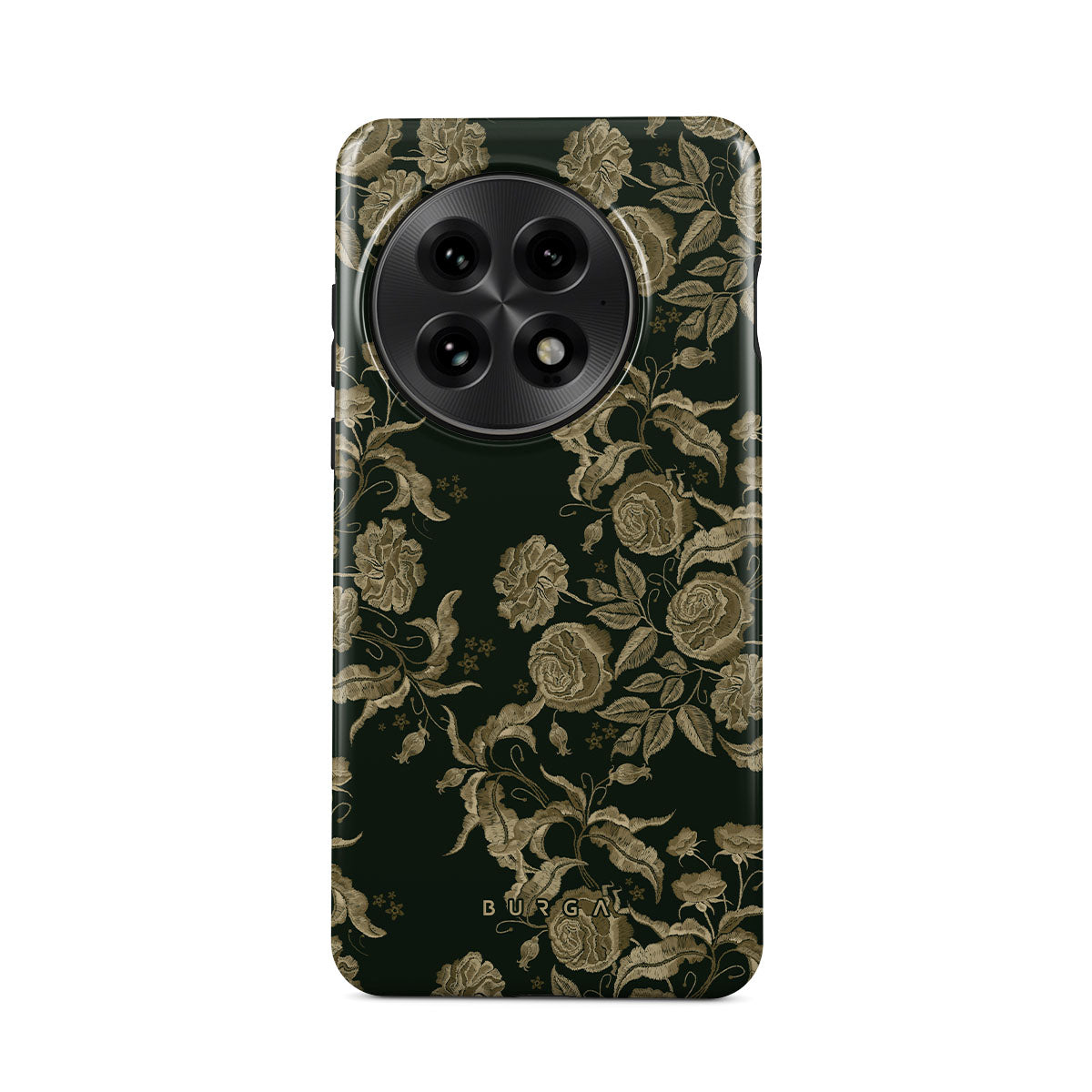 En este diseño: rosas vintage, follaje dorado, tonos verde oscuro.