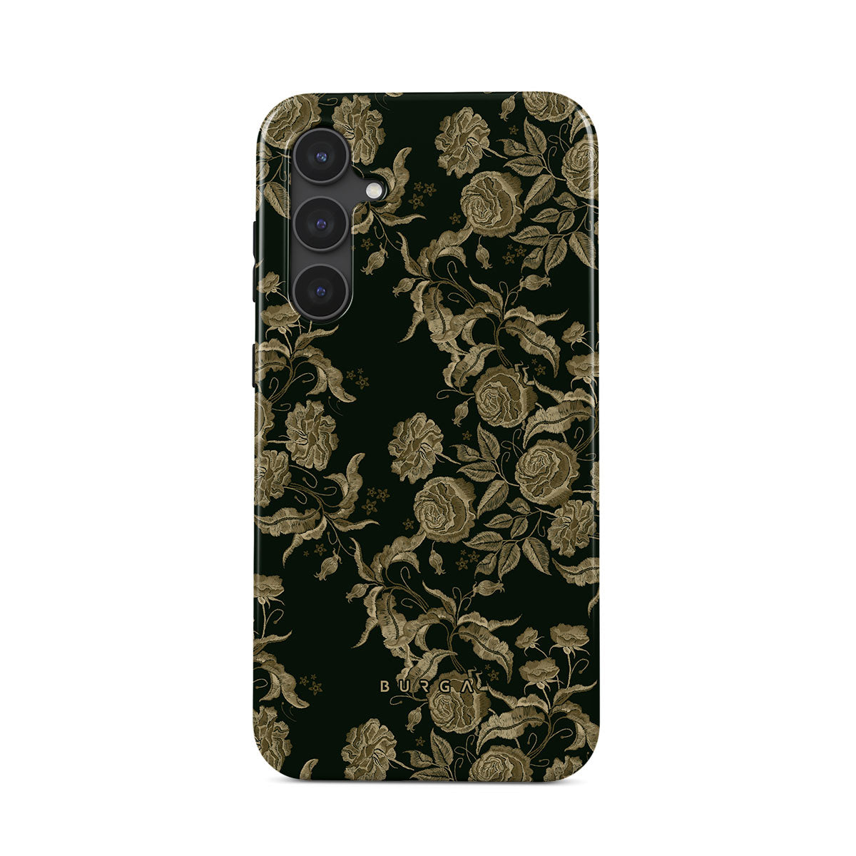 En este diseño: rosas vintage, follaje dorado, tonos verde oscuro.