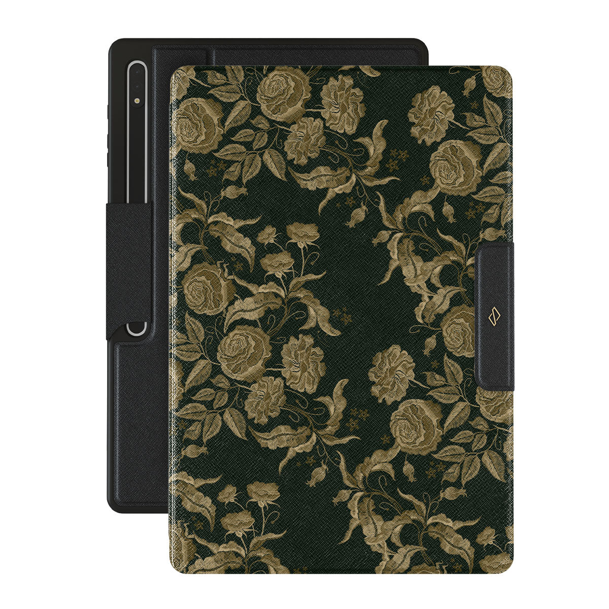 En este diseño: rosas vintage, hojas doradas, tonos verde intenso.