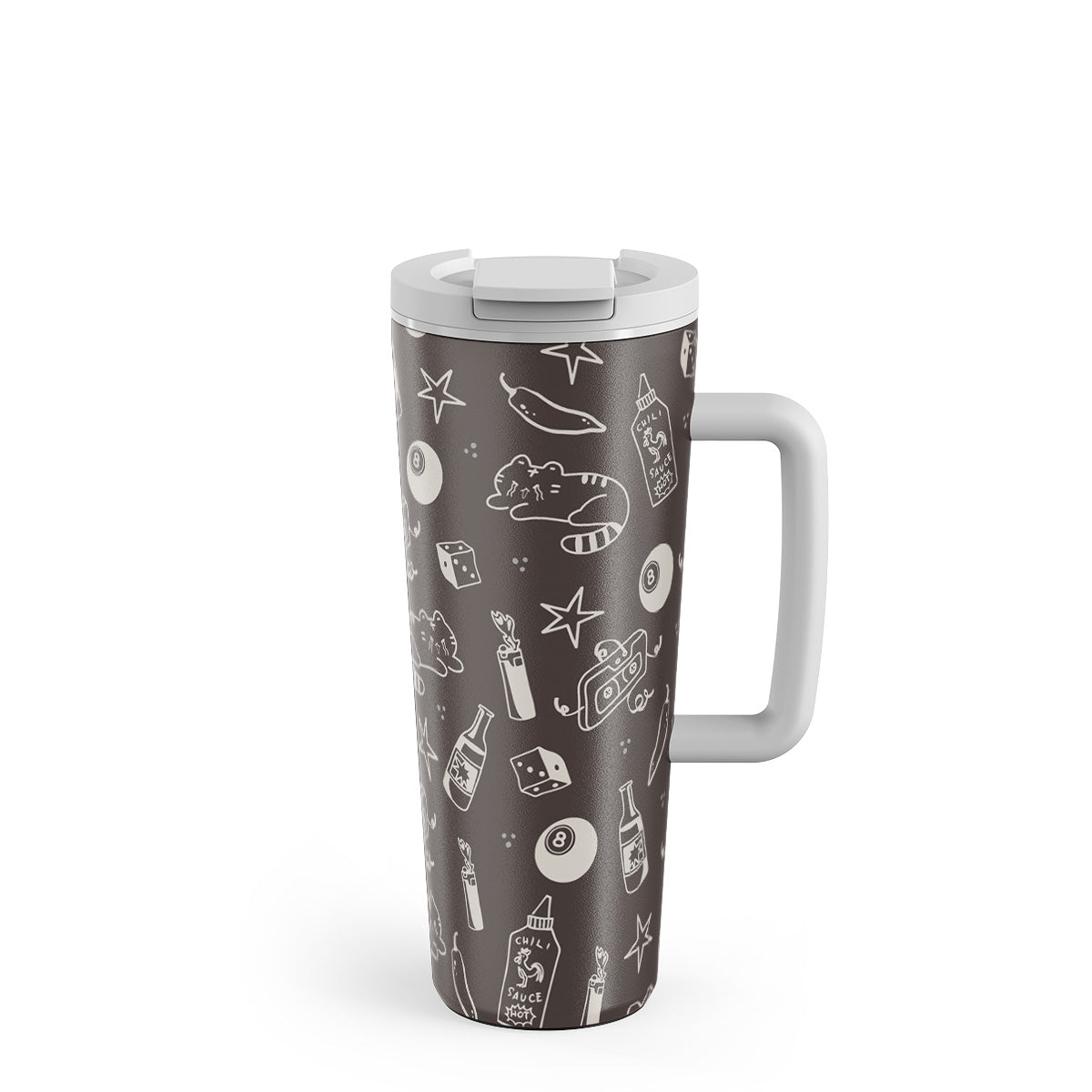 En este diseño: fondo marrón, garabatos graciosos, gatos, estrellas, pimienta, dados, bola de billar y cinta de mezclas