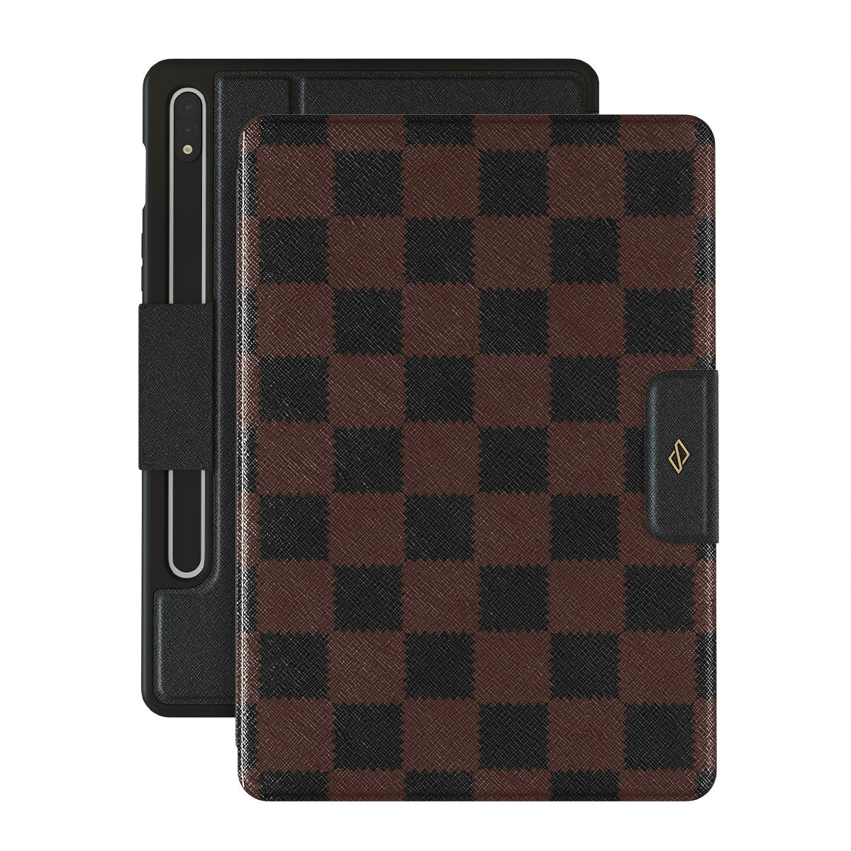 En este diseño: patrón de cuadros, tonos marrones y oscuros y geométrico