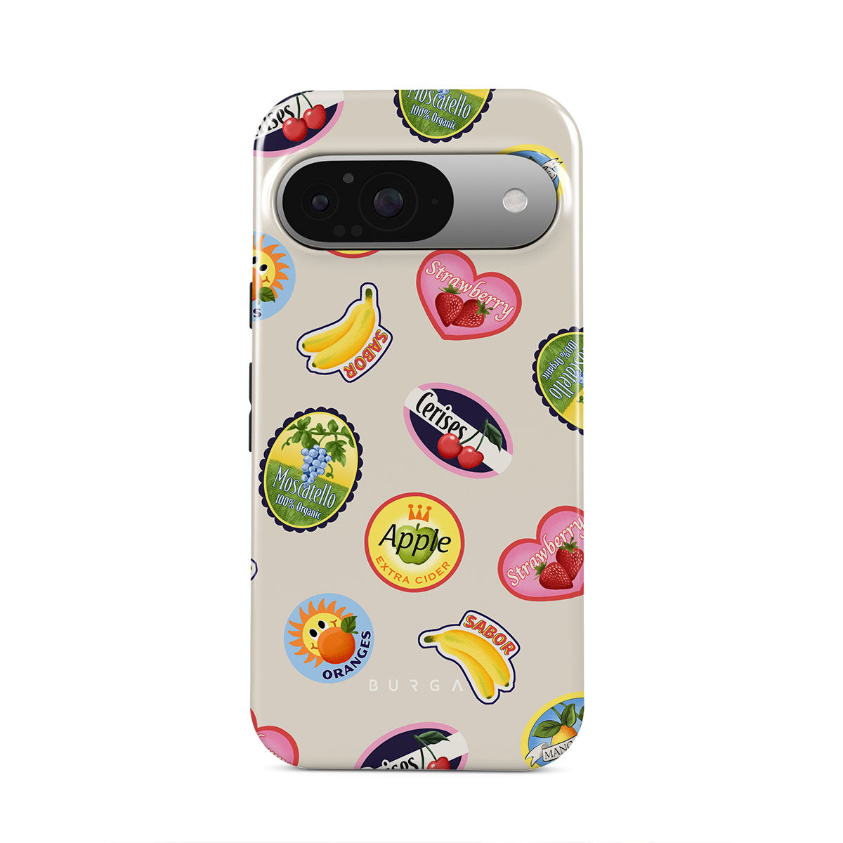 En este diseño: Plátanos, sellos, cerezas, manzanas, naranjas, fresas, colores brillantes, acentos cítricos, motivos frutales, patrones tropicales.