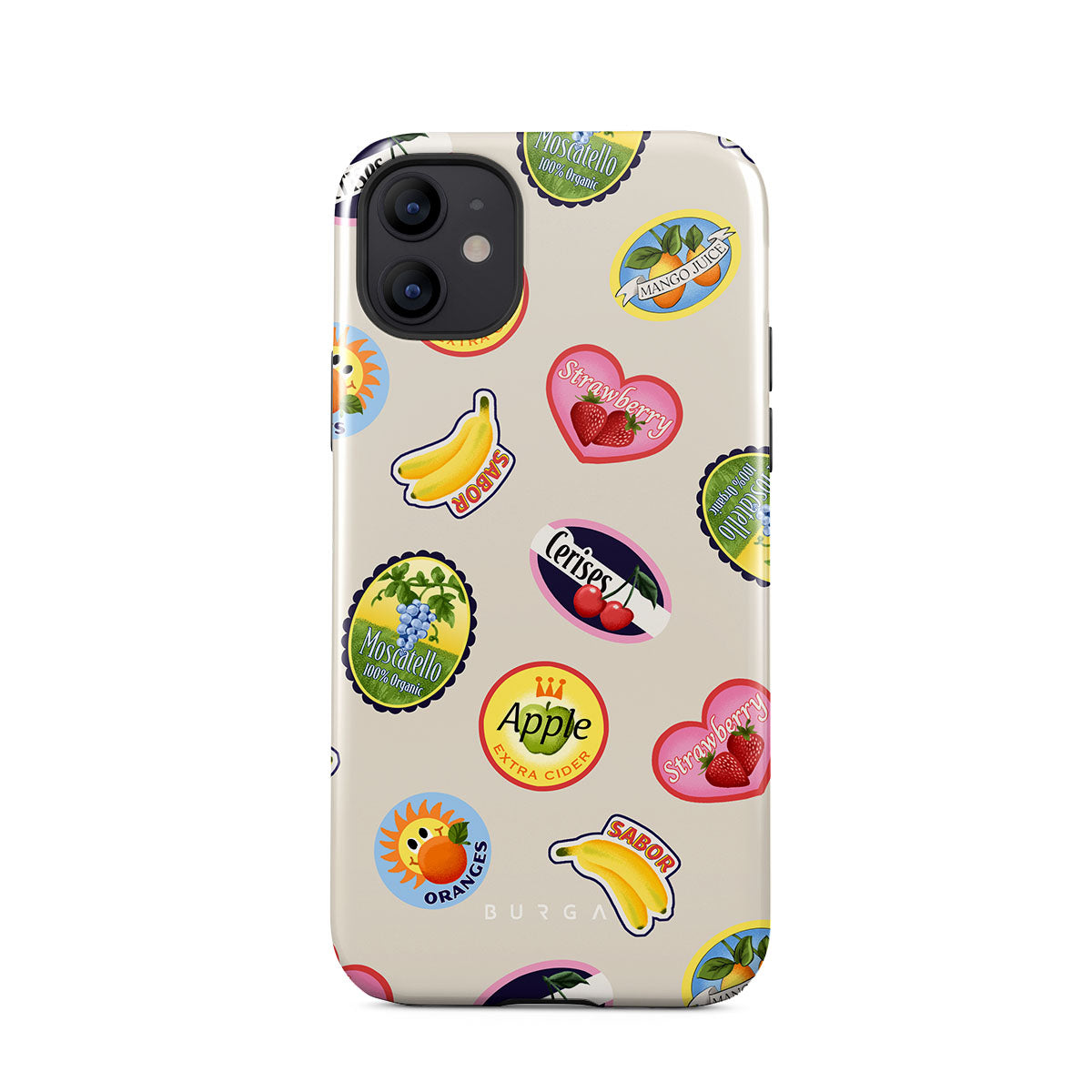 En este diseño: Plátanos, sellos, cerezas, manzanas, naranjas, fresas, colores brillantes, acentos cítricos, motivos frutales, patrones tropicales.
