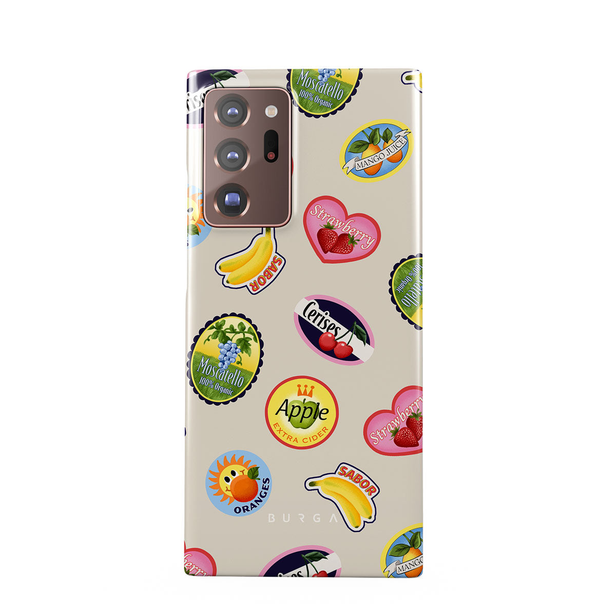 En este diseño: Plátanos, sellos, cerezas, manzanas, naranjas, fresas, colores brillantes, acentos cítricos, motivos frutales, patrones tropicales.