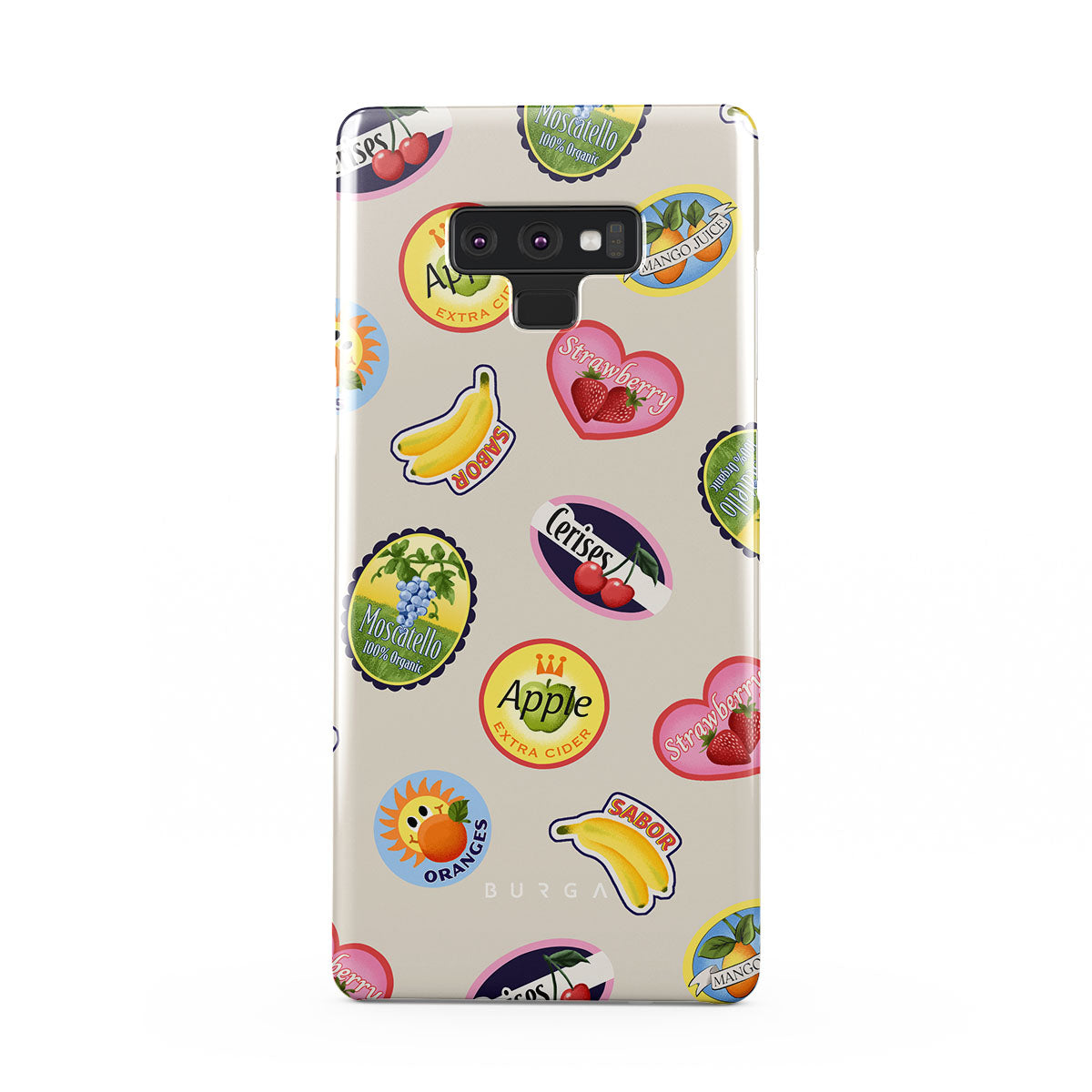 En este diseño: Plátanos, sellos, cerezas, manzanas, naranjas, fresas, colores brillantes, acentos cítricos, motivos frutales, patrones tropicales.