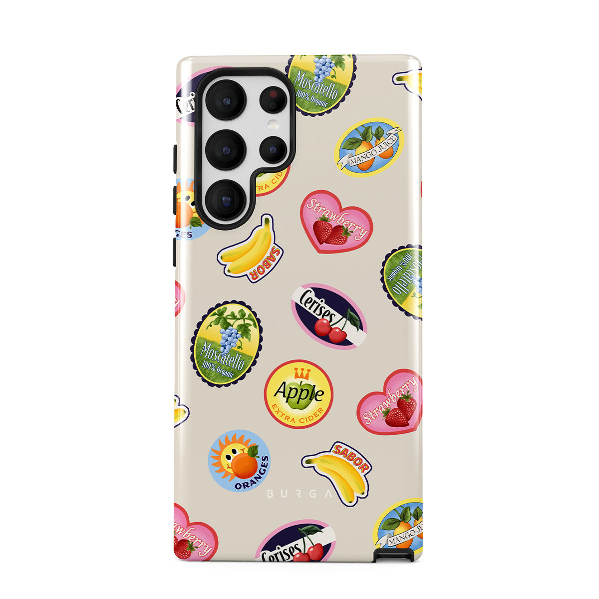 En este diseño: Plátanos, sellos, cerezas, manzanas, naranjas, fresas, colores brillantes, acentos cítricos, motivos frutales, patrones tropicales.