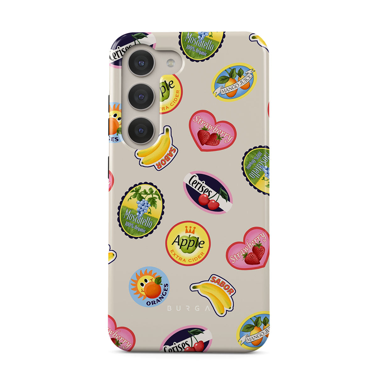 En este diseño: Plátanos, sellos, cerezas, manzanas, naranjas, fresas, colores brillantes, acentos cítricos, motivos frutales, patrones tropicales.