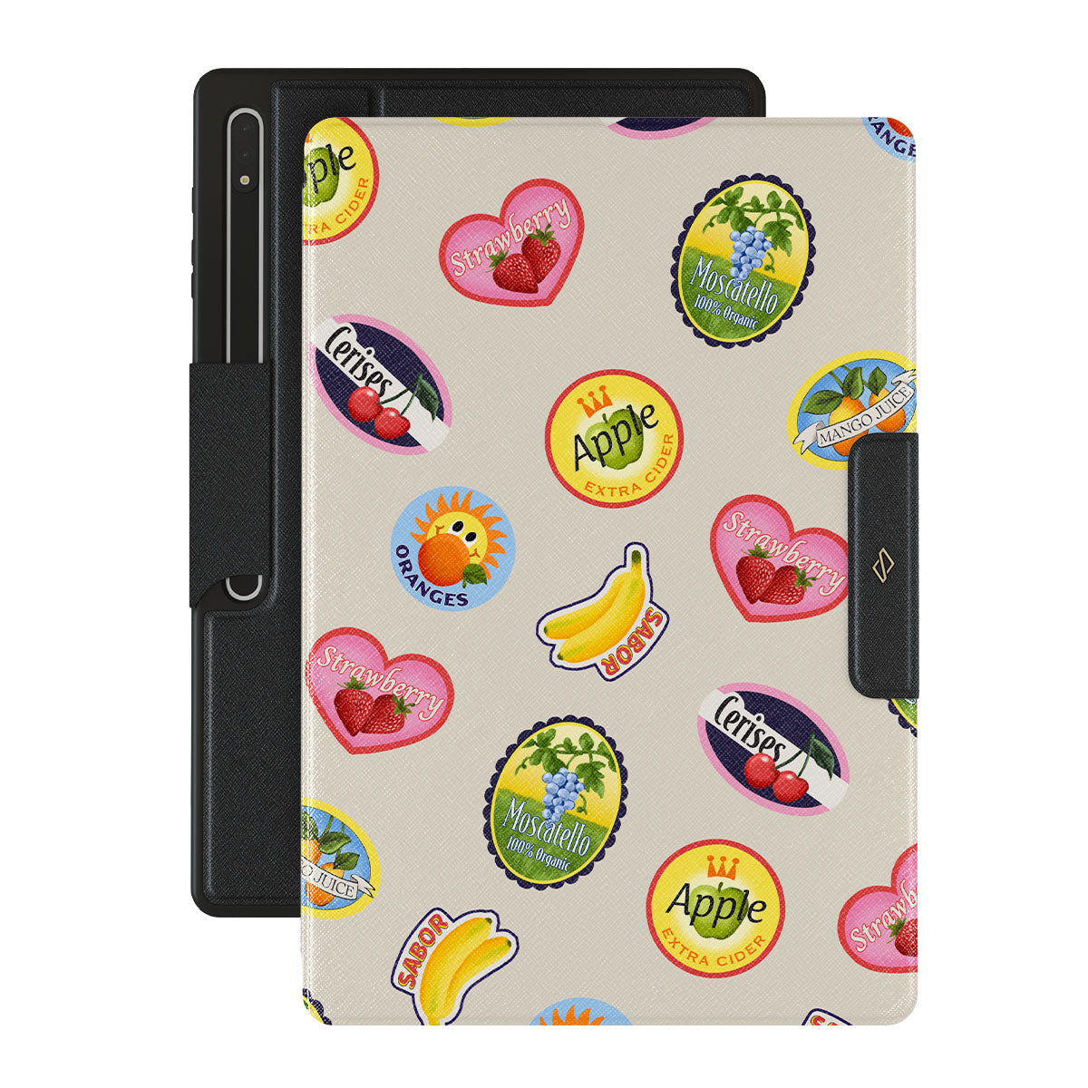 En este diseño: Plátanos, sellos, cerezas, manzanas, naranjas, fresas, colores brillantes, acentos cítricos, motivos frutales, patrones tropicales.