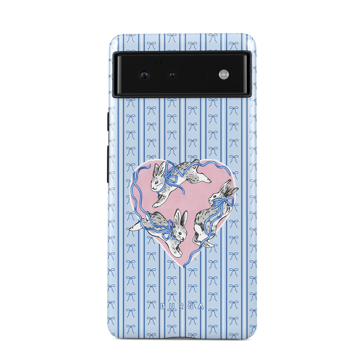 En este diseño: conejos blancos, marco de corazones, rayas azules