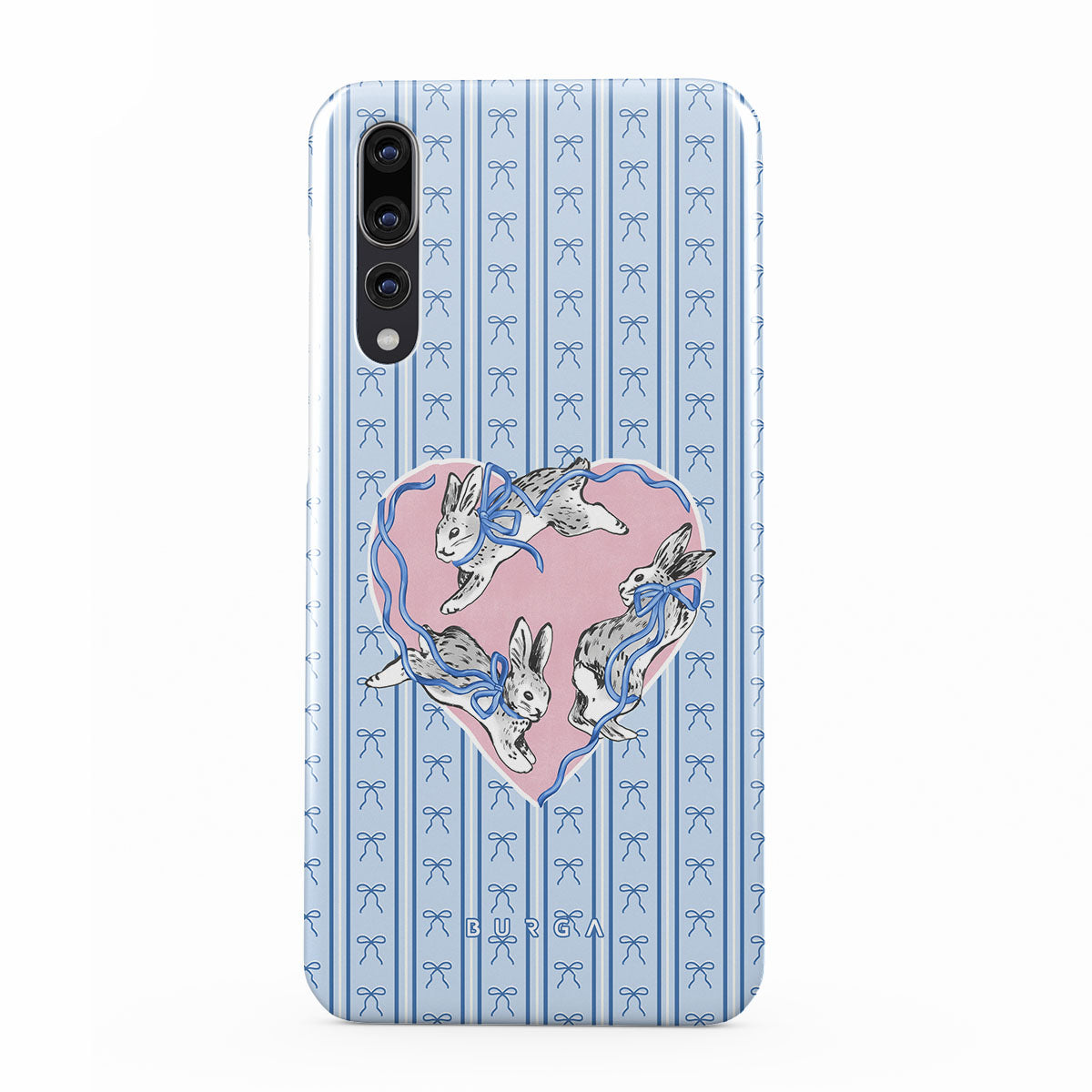 En este diseño: conejos blancos, marco de corazones, rayas azules