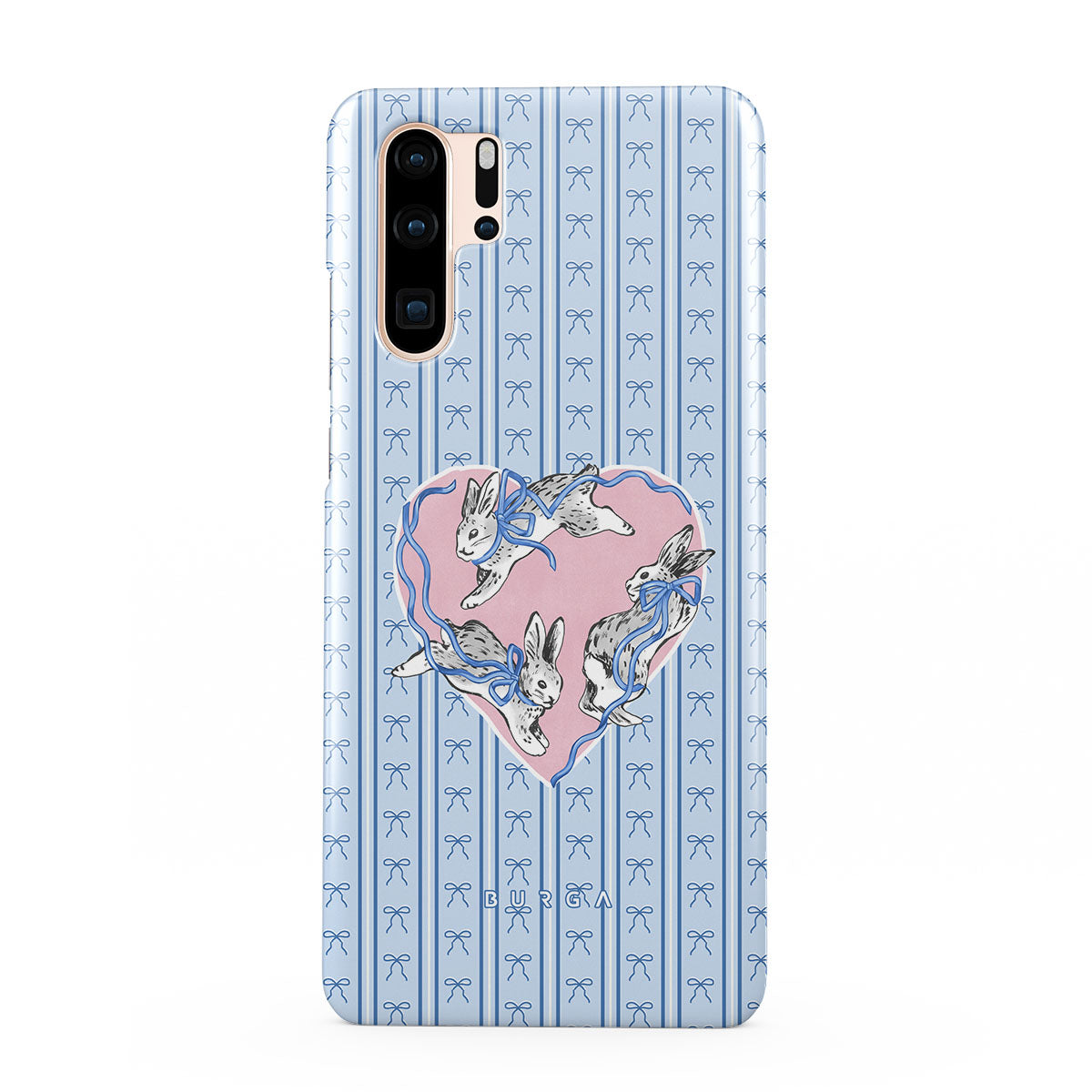 En este diseño: conejos blancos, marco de corazones, rayas azules