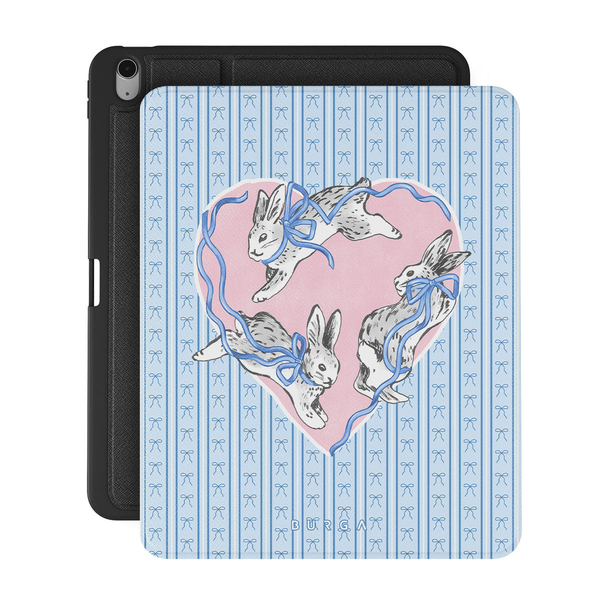 En este diseño: conejos blancos, marco de corazones, rayas azules