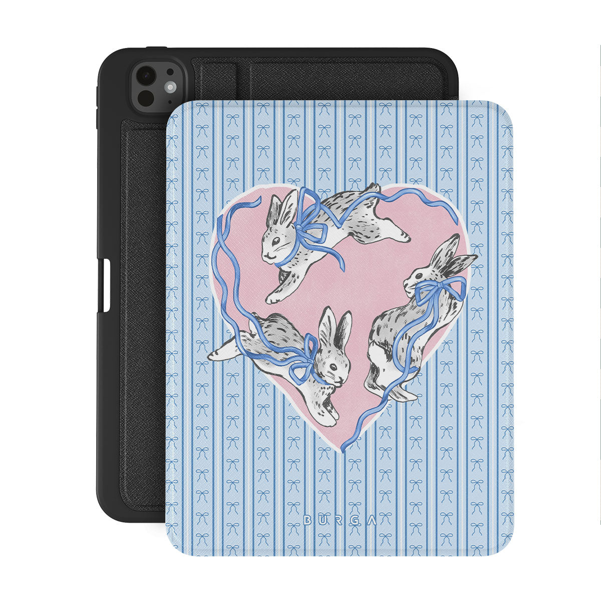 En este diseño: conejos blancos, marco de corazones, rayas azules