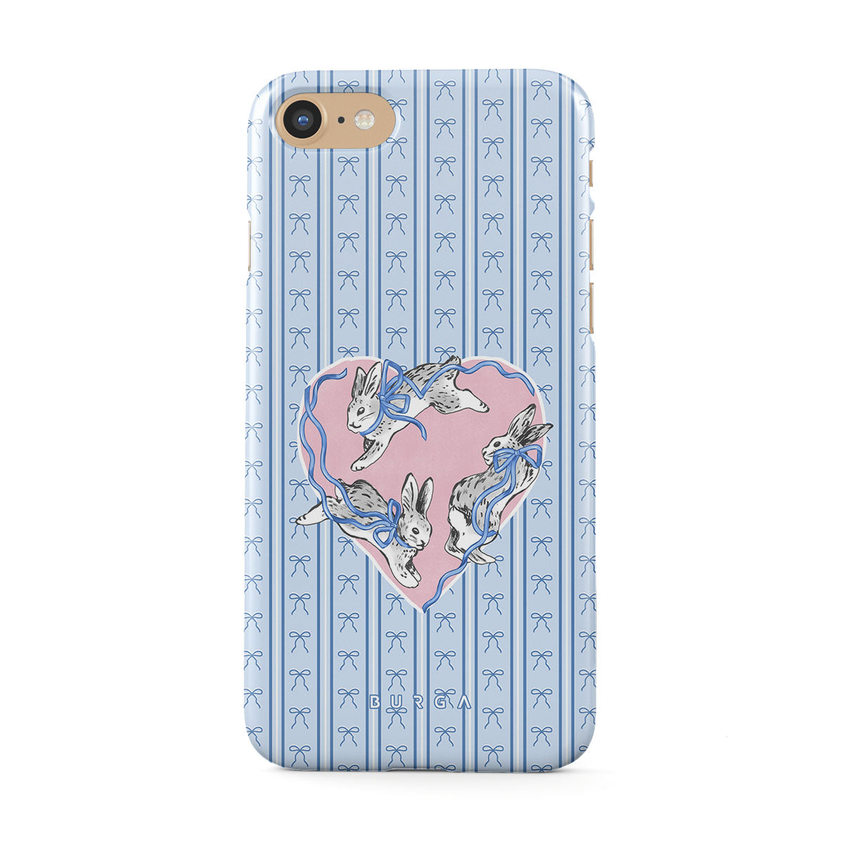 En este diseño: conejos blancos, marco de corazones, rayas azules
