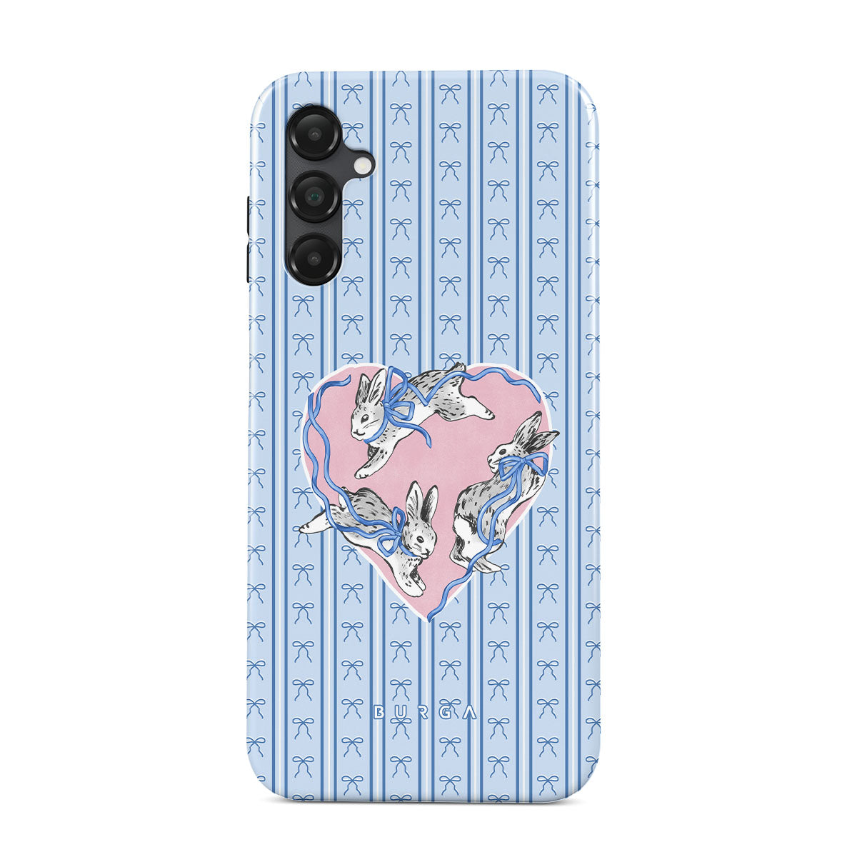 En este diseño: conejos blancos, marco de corazones, rayas azules