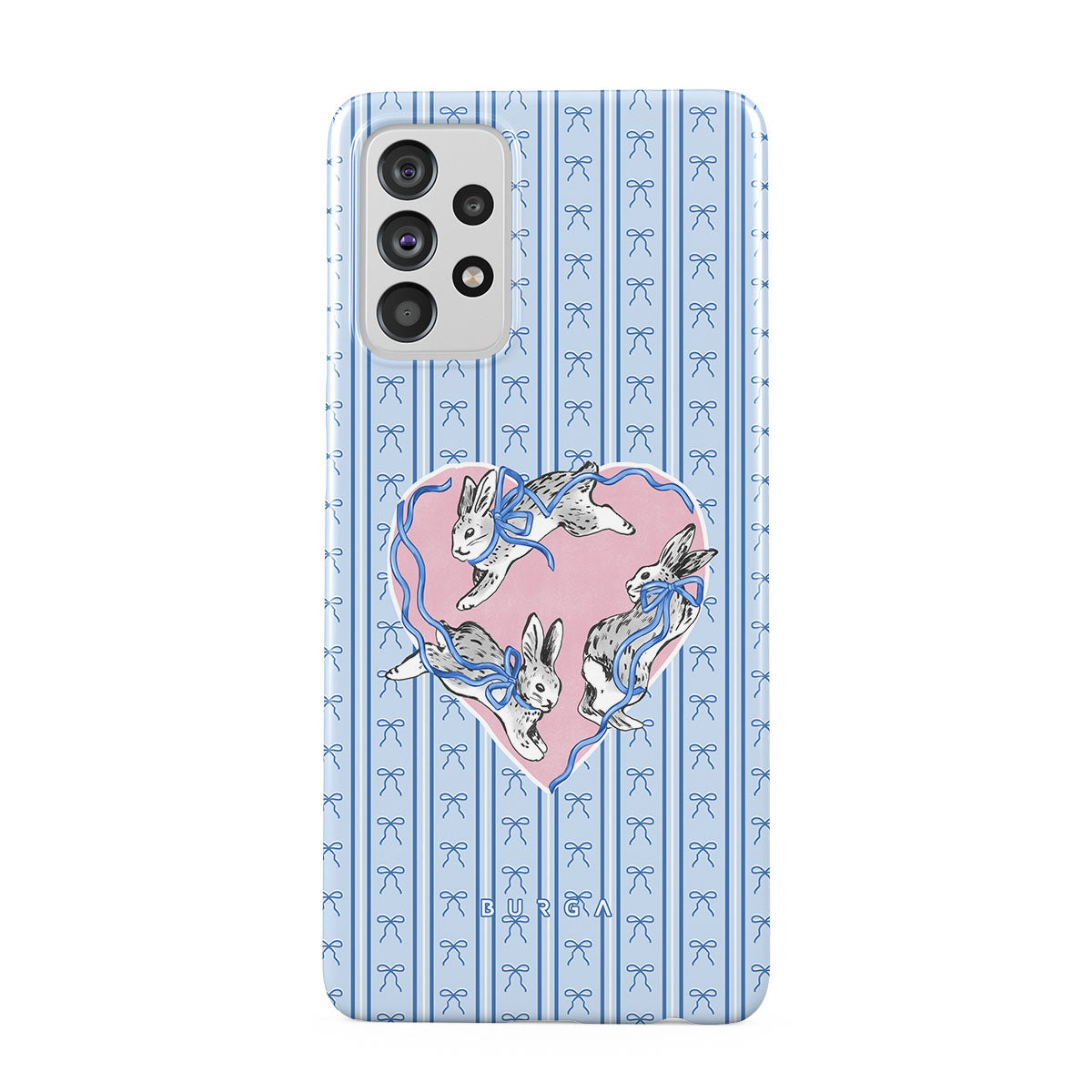 En este diseño: conejos blancos, marco de corazones, rayas azules