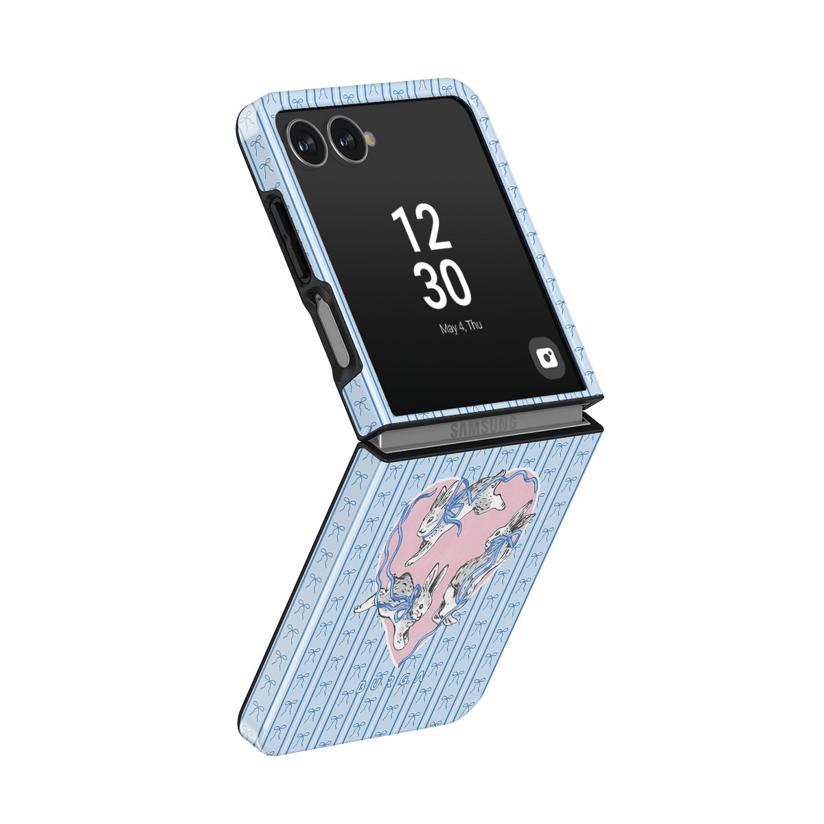En este diseño: conejos blancos, marco de corazones, rayas azules