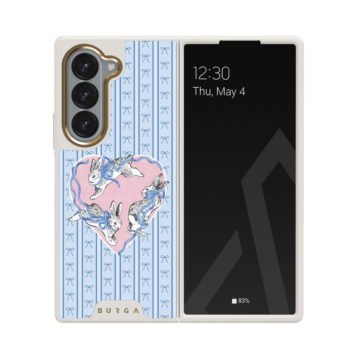 En este diseño: conejos blancos, marco de corazones, rayas azules