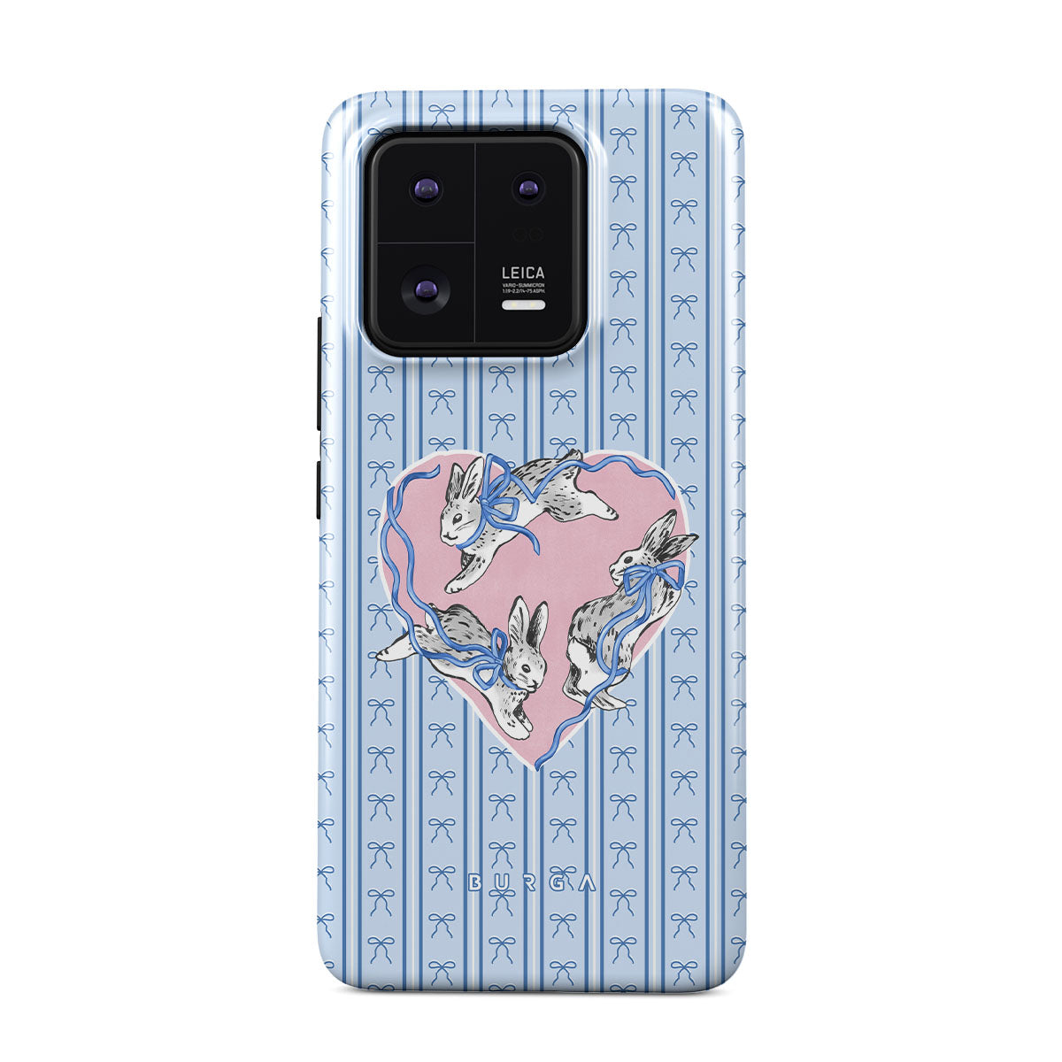 En este diseño: conejos blancos, marco de corazones, rayas azules