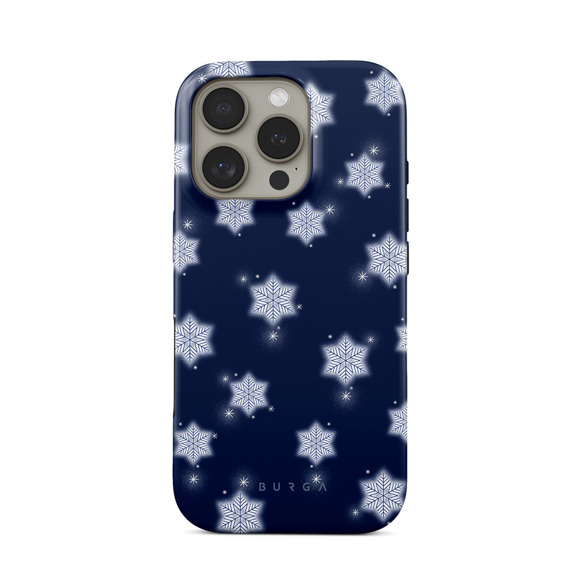 En este diseño: copos de nieve blancos, fondo azul marino, patrón de copos de nieve invernales, copos de nieve geométricos, diseño invernal clásico