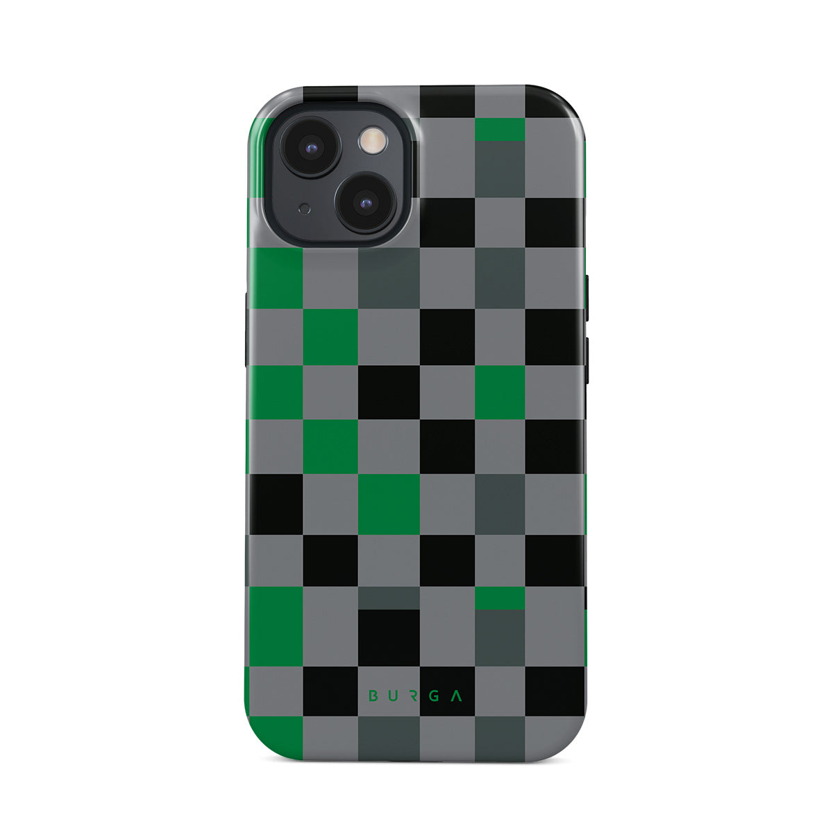 En este diseño: patrón de cuadros, verde, gris y negro y geométrico