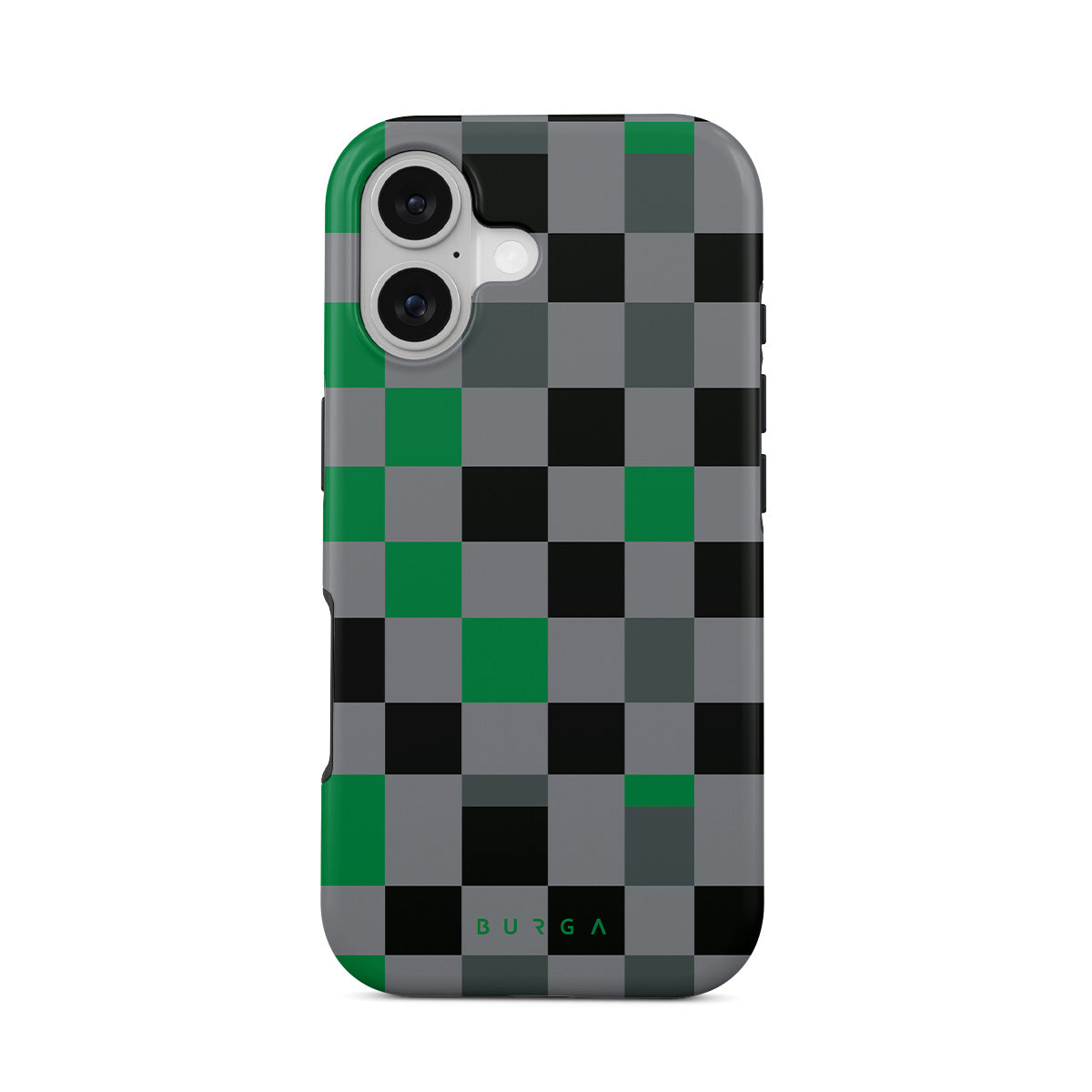 En este diseño: patrón de cuadros, verde, gris y negro y geométrico