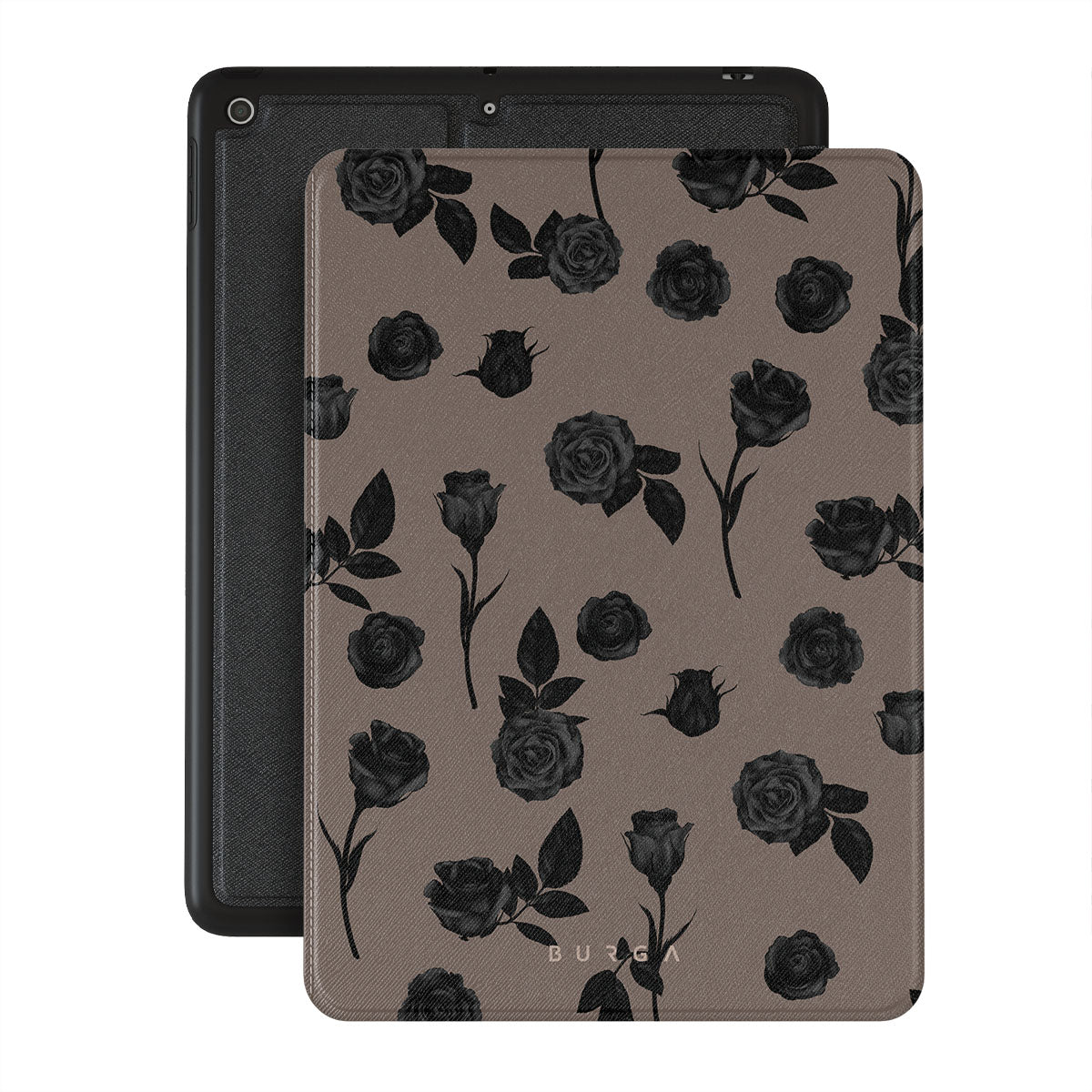 En este diseño: rosas negras, tonos terrosos, detalles florales y flores oscuras.