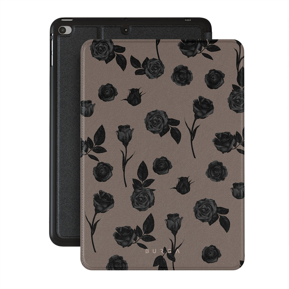 En este diseño: rosas negras, tonos terrosos, detalles florales y flores oscuras.