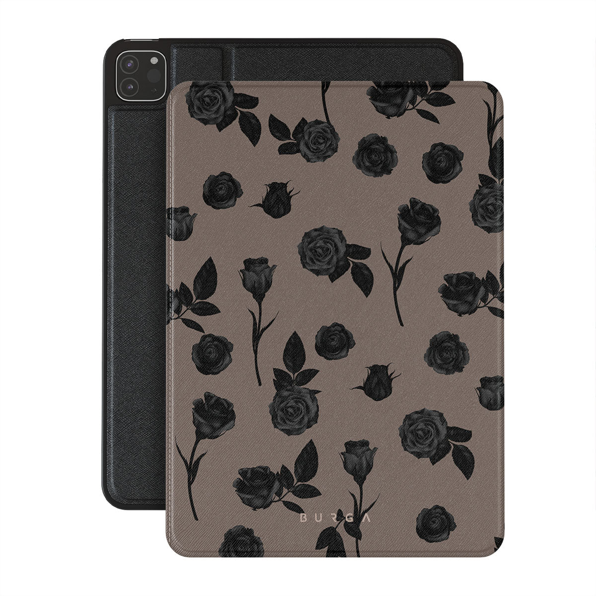 En este diseño: rosas negras, tonos terrosos, detalles florales y flores oscuras.