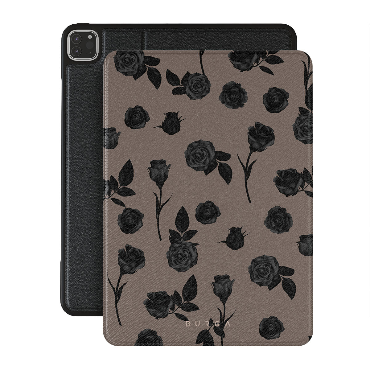 En este diseño: rosas negras, tonos terrosos, detalles florales y flores oscuras.