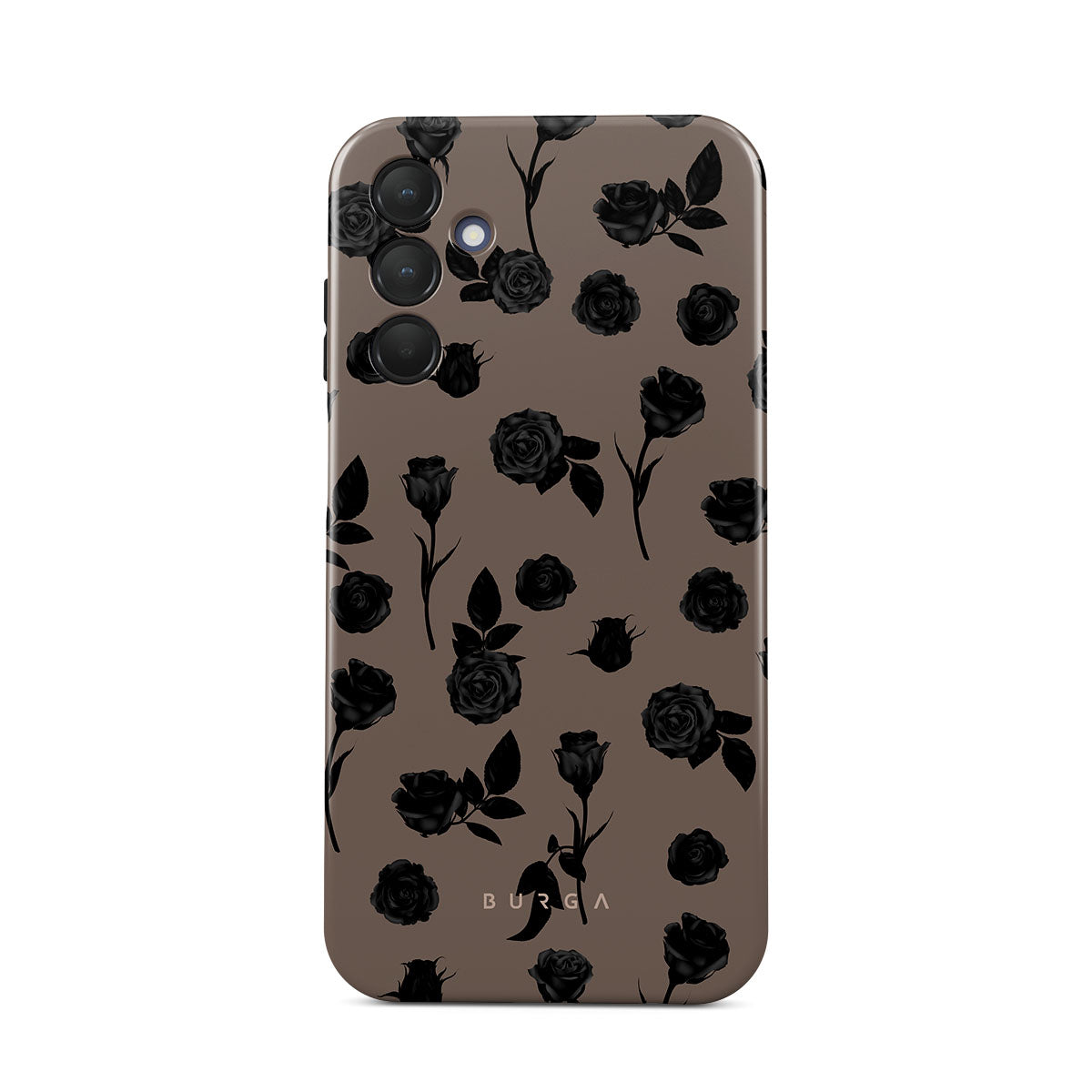 En este diseño: rosas negras, tonos terrosos, detalles florales y flores oscuras.