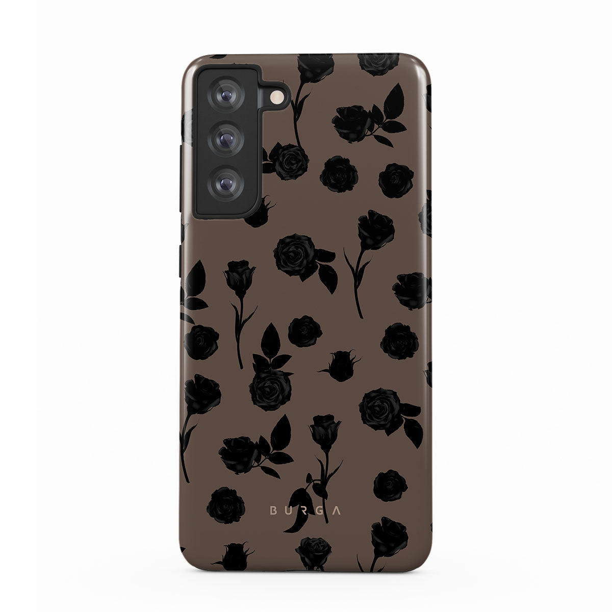 En este diseño: rosas negras, tonos terrosos, detalles florales y flores oscuras.