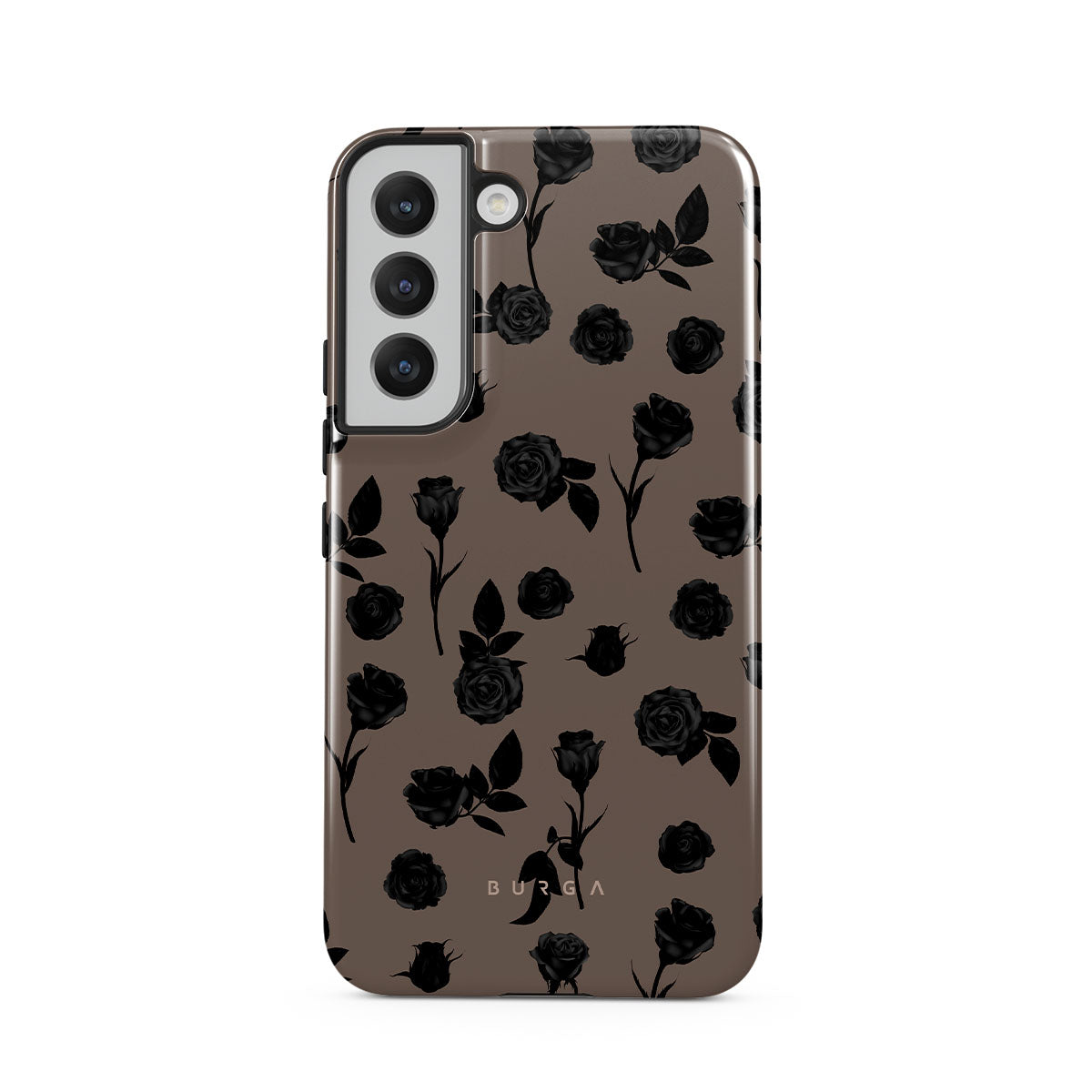 En este diseño: rosas negras, tonos terrosos, detalles florales y flores oscuras.