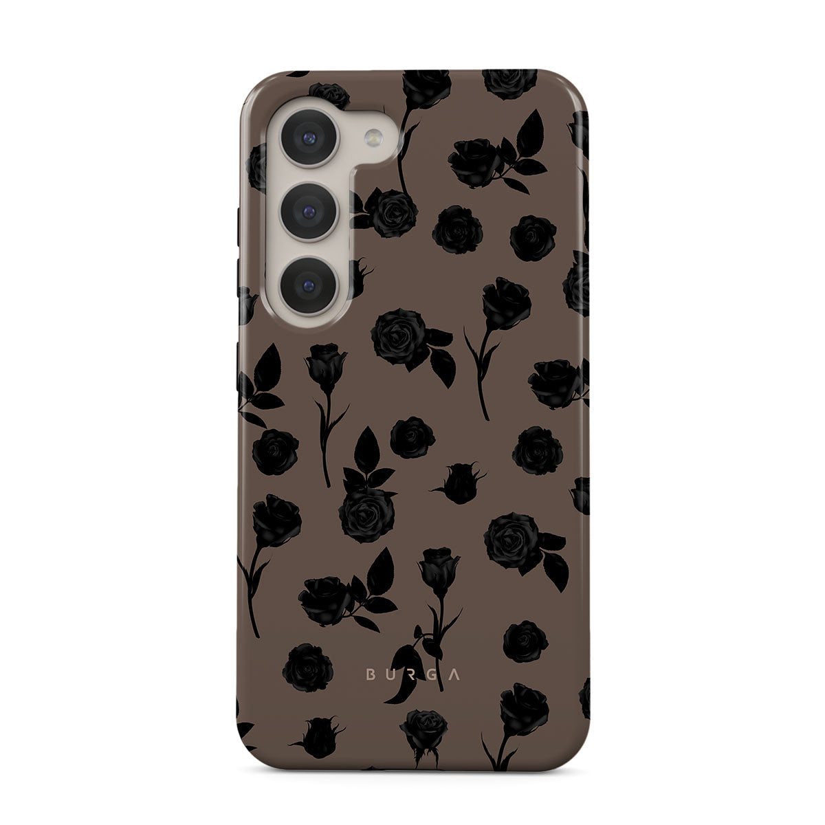 En este diseño: rosas negras, tonos terrosos, detalles florales y flores oscuras.