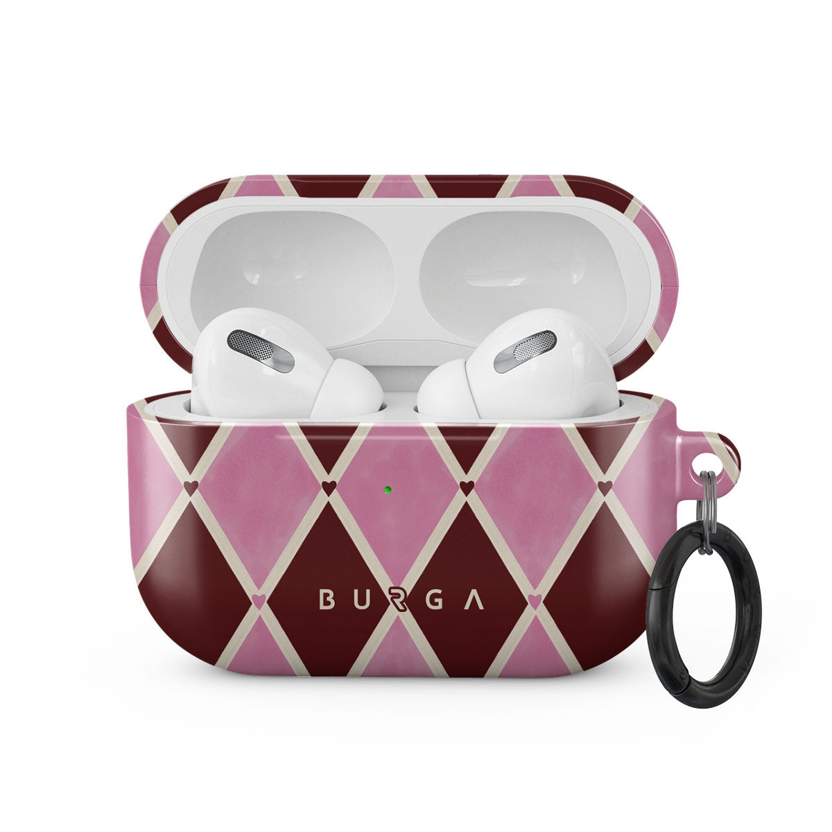 En este diseño: patrón de arlequín, diamantes rosas, fondo rojo profundo