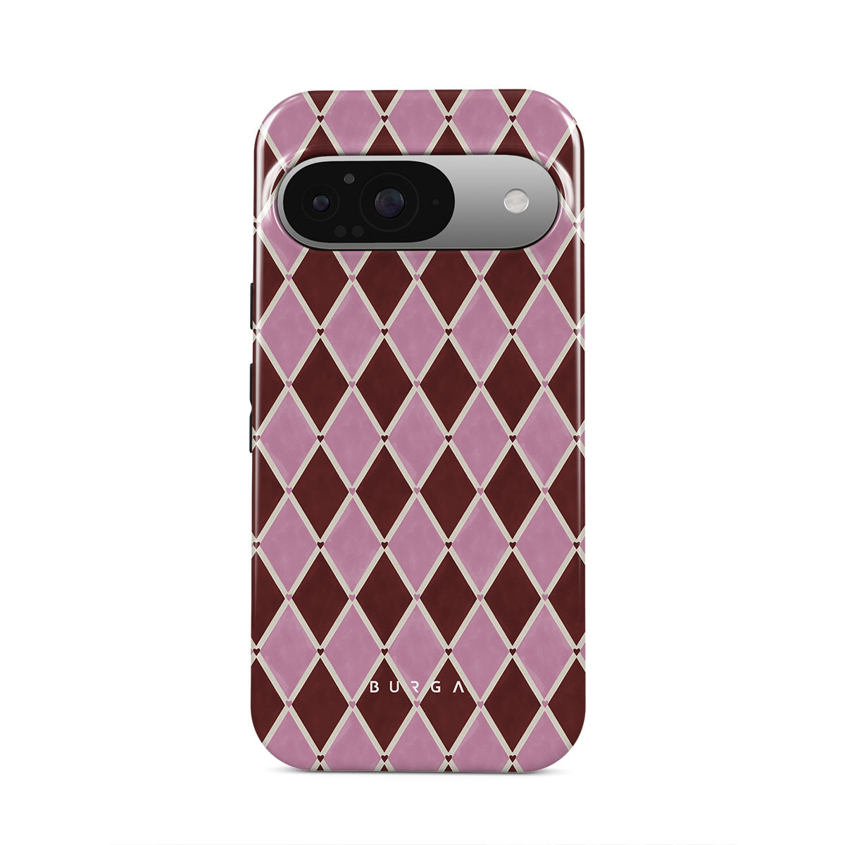 En este diseño: patrón de arlequín, diamantes rosas, fondo rojo profundo