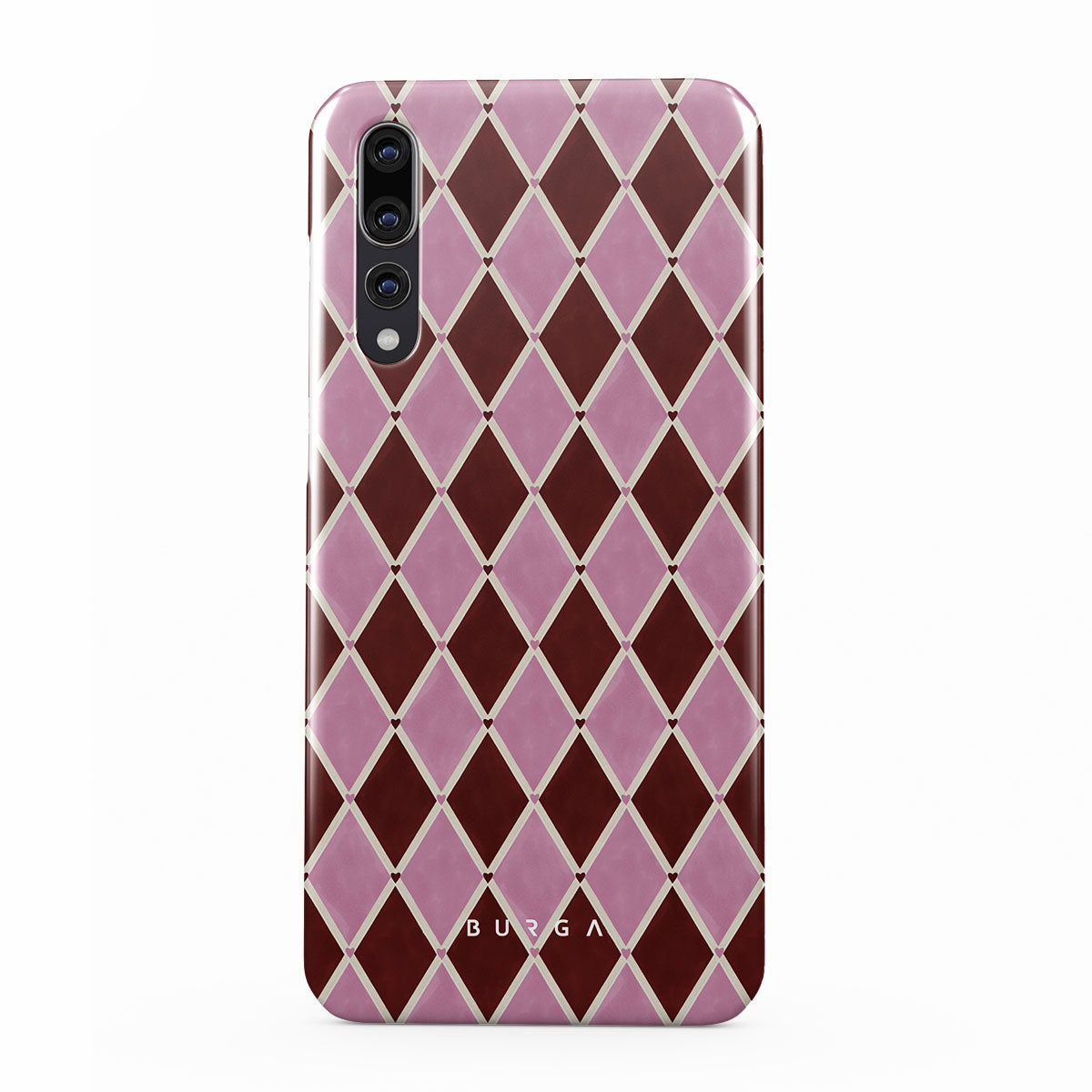 En este diseño: patrón de arlequín, diamantes rosas, fondo rojo profundo