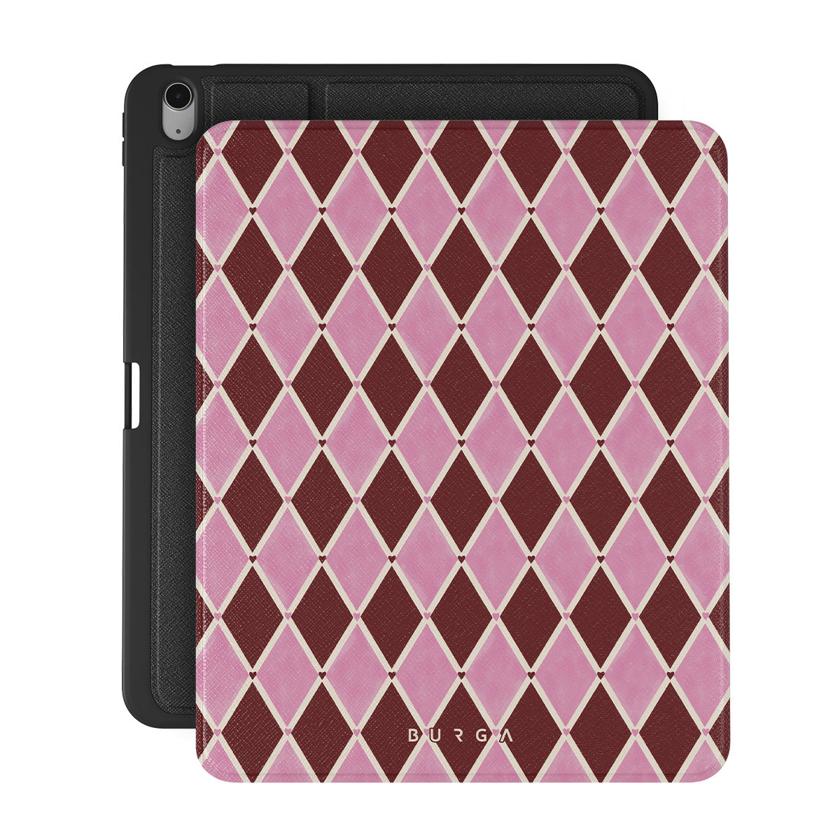 En este diseño: patrón de arlequín, diamantes rosas, fondo rojo profundo