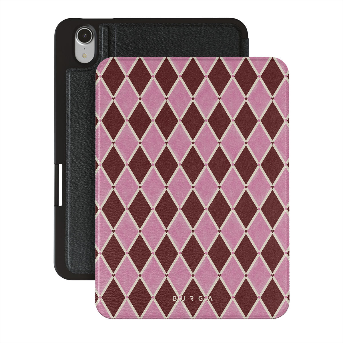 En este diseño: patrón de arlequín, diamantes rosas, fondo rojo profundo