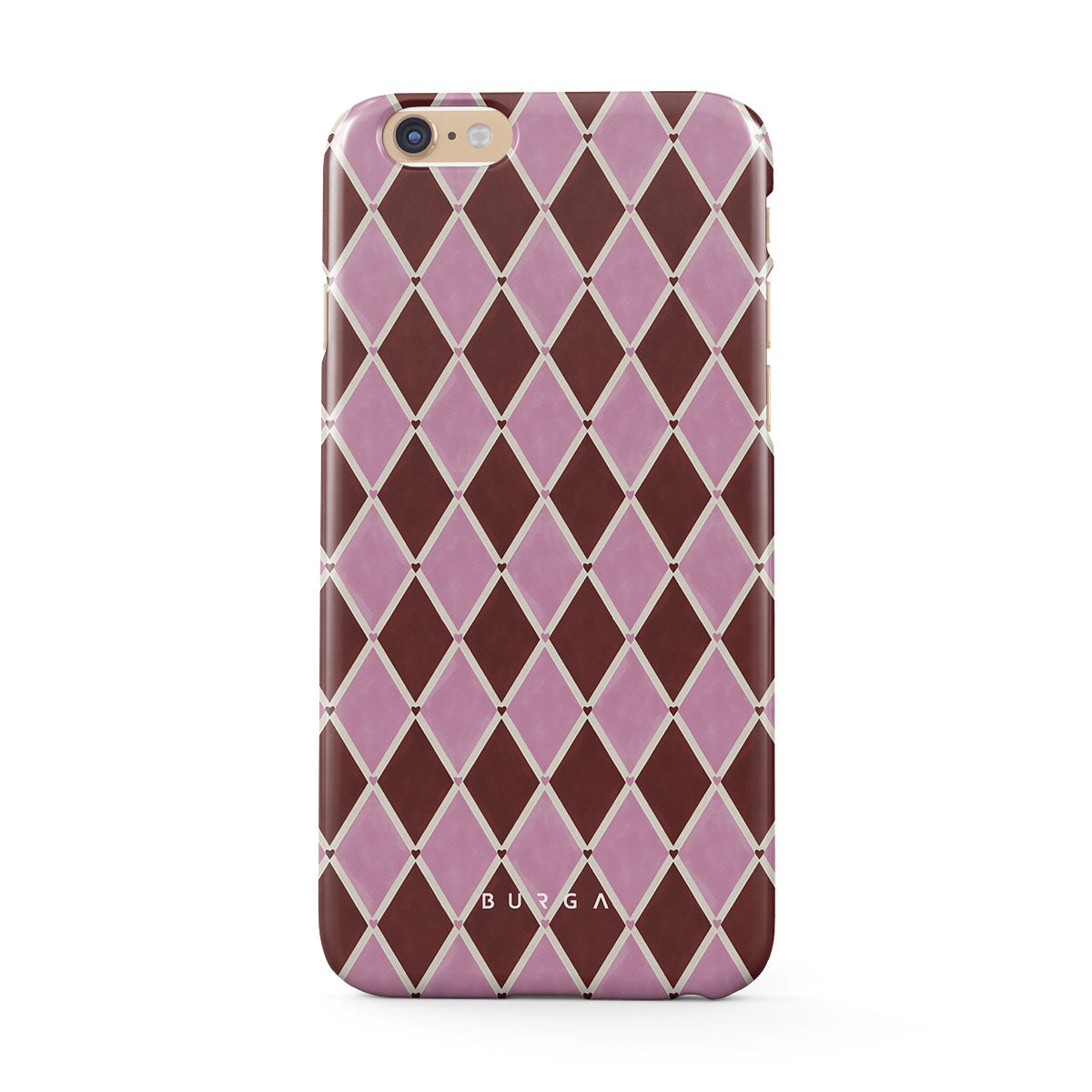 En este diseño: patrón de arlequín, diamantes rosas, fondo rojo profundo