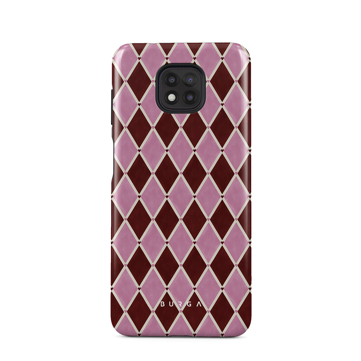 En este diseño: patrón de arlequín, diamantes rosas, fondo rojo profundo