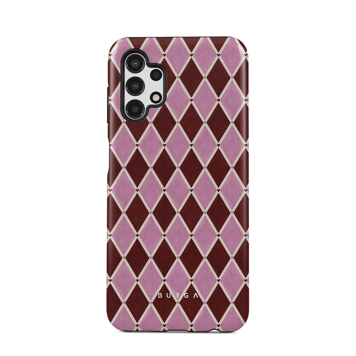 En este diseño: patrón de arlequín, diamantes rosas, fondo rojo profundo