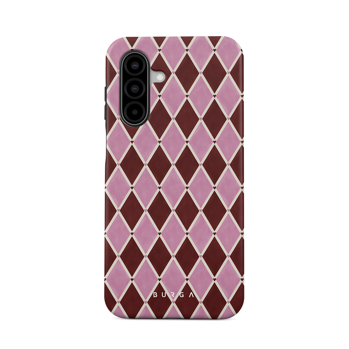 En este diseño: patrón de arlequín, diamantes rosas, fondo rojo profundo