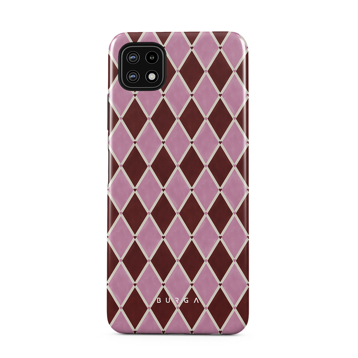 En este diseño: patrón de arlequín, diamantes rosas, fondo rojo profundo